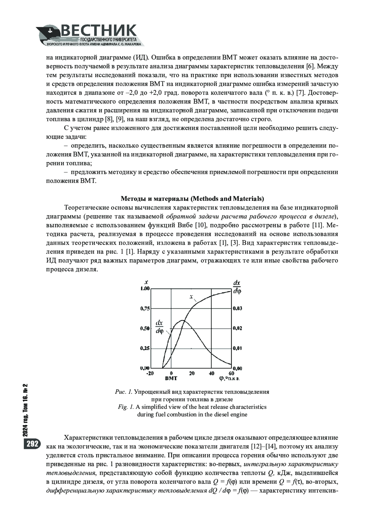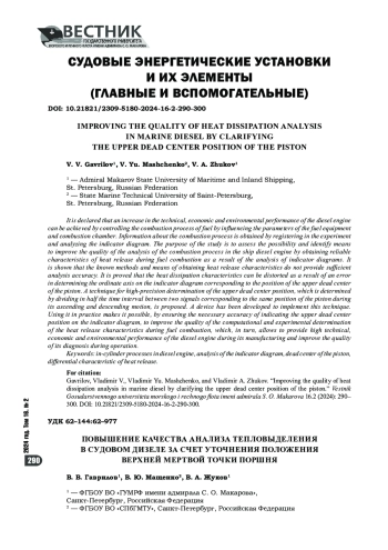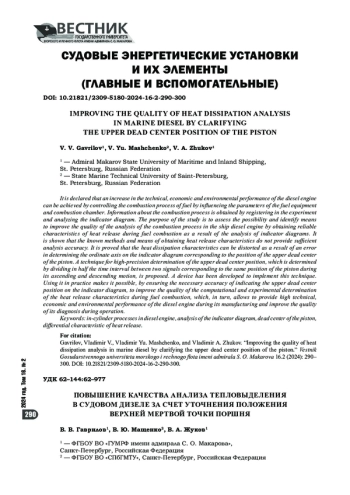 Отмечается, что повышение технико-экономических и экологических показателей дизеля может быть достигнуто с помощью управления процессом горения топлива посредством воздействия на параметры топливной аппаратуры и камеры сгорания. Предлагается информацию о процессе горения получать посредством регистрации в процессе проведения эксперимента двух симметрично расположенных относительно верхней мертвой точки поршня угловых положений коленчатого вала и анализа индикаторной диаграммы. Целью выполненного исследования являлась оценка возможности и определения средств повышения качества анализа процесса горения в судовом дизеле за счет получения достоверных характеристик тепловыделения при горении топлива в результате анализа индикаторных диаграмм. Показано, что известные методы и средства получения характеристик тепловыделения не обеспечивают достаточной точности анализа. В работе доказано, что характеристики тепловыделения могут быть искажены в результате ошибки в определении на индикаторной диаграмме оси ординат, соответствующей положению верхней мертвой точки поршня. Предложена методика высокоточного определения положения верхней мертвой точки, которое получают делением пополам интервала времени между двумя сигналами, соответствующими одному и тому же положению поршня при восходящем и нисходящем его движении. Разработано устройство для реализации указанной методики. Использование предложенной методики на практике позволит за счет обеспечения необходимой точности указания положения верхней мертвой точки на индикаторной диаграмме повысить качество расчетно-экспериментального определения характеристик выделения теплоты при сгорании топлива, что в свою очередь дает возможность обеспечить высокие технико-экономические и экологические показателей дизеля при его создании и повысить качество его диагностирования в процессе эксплуатации.