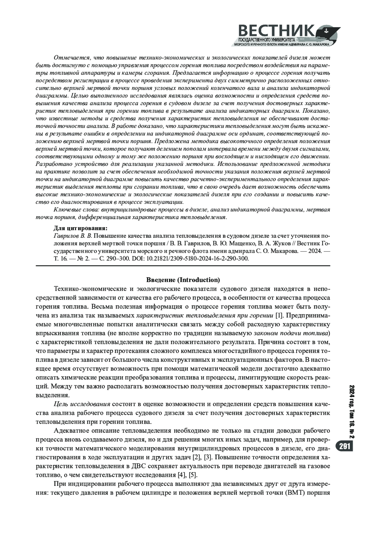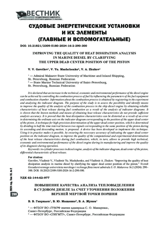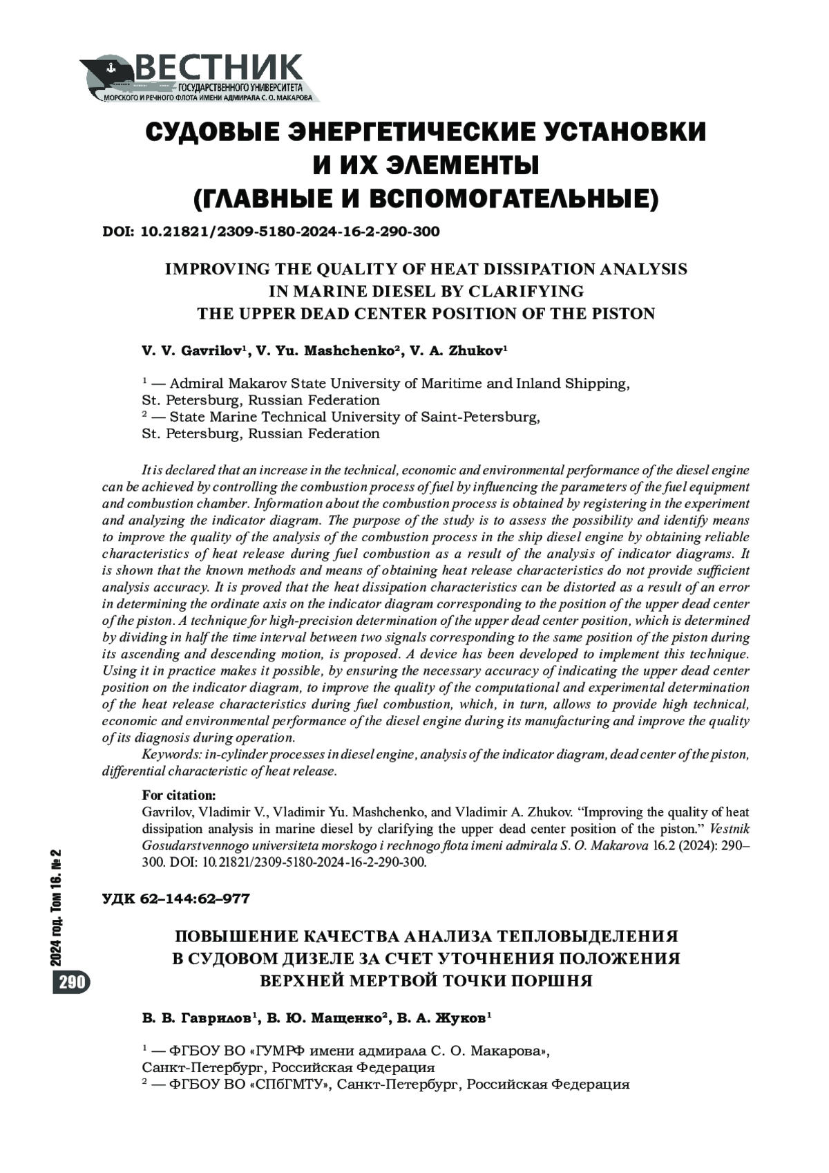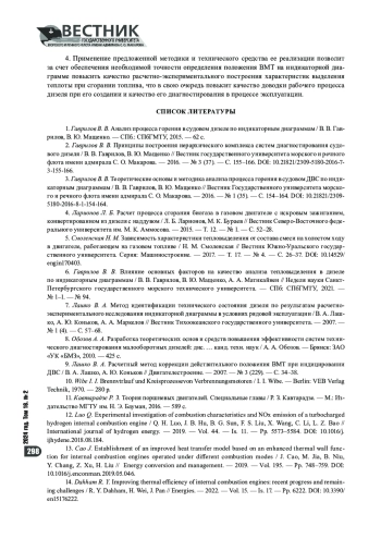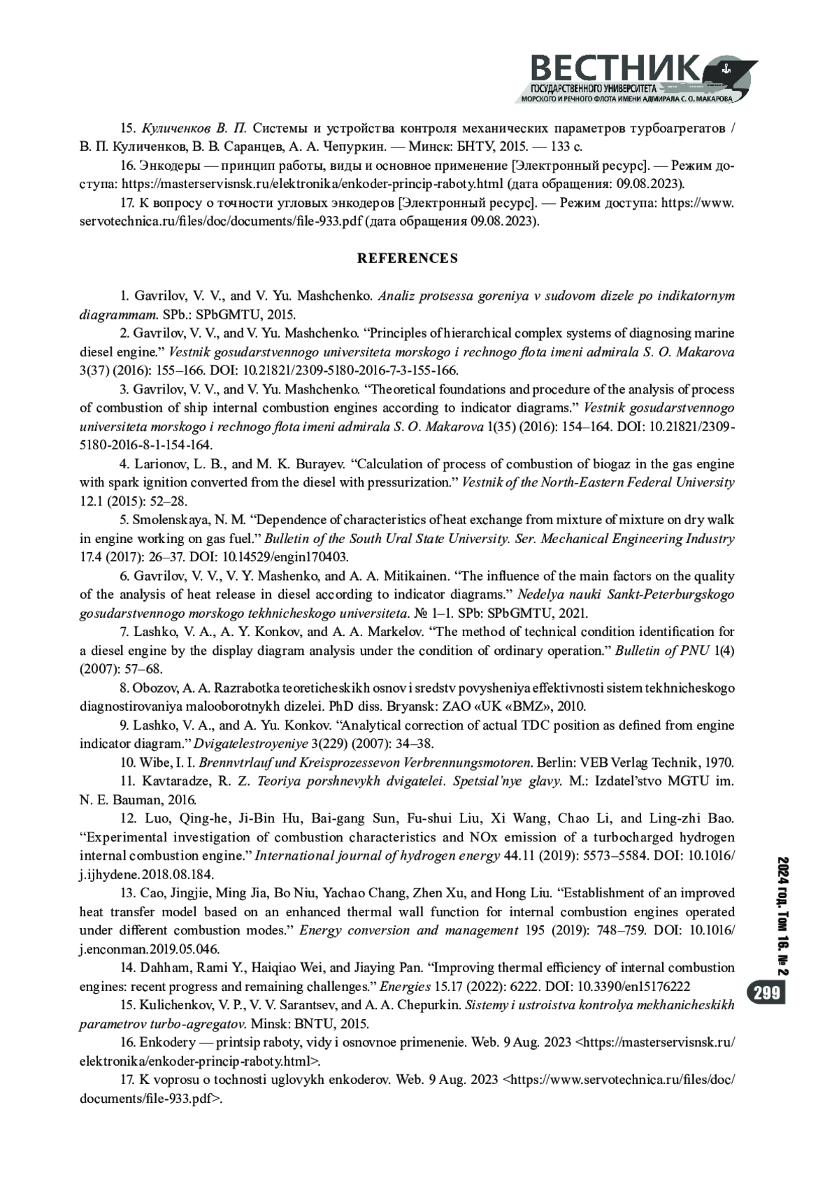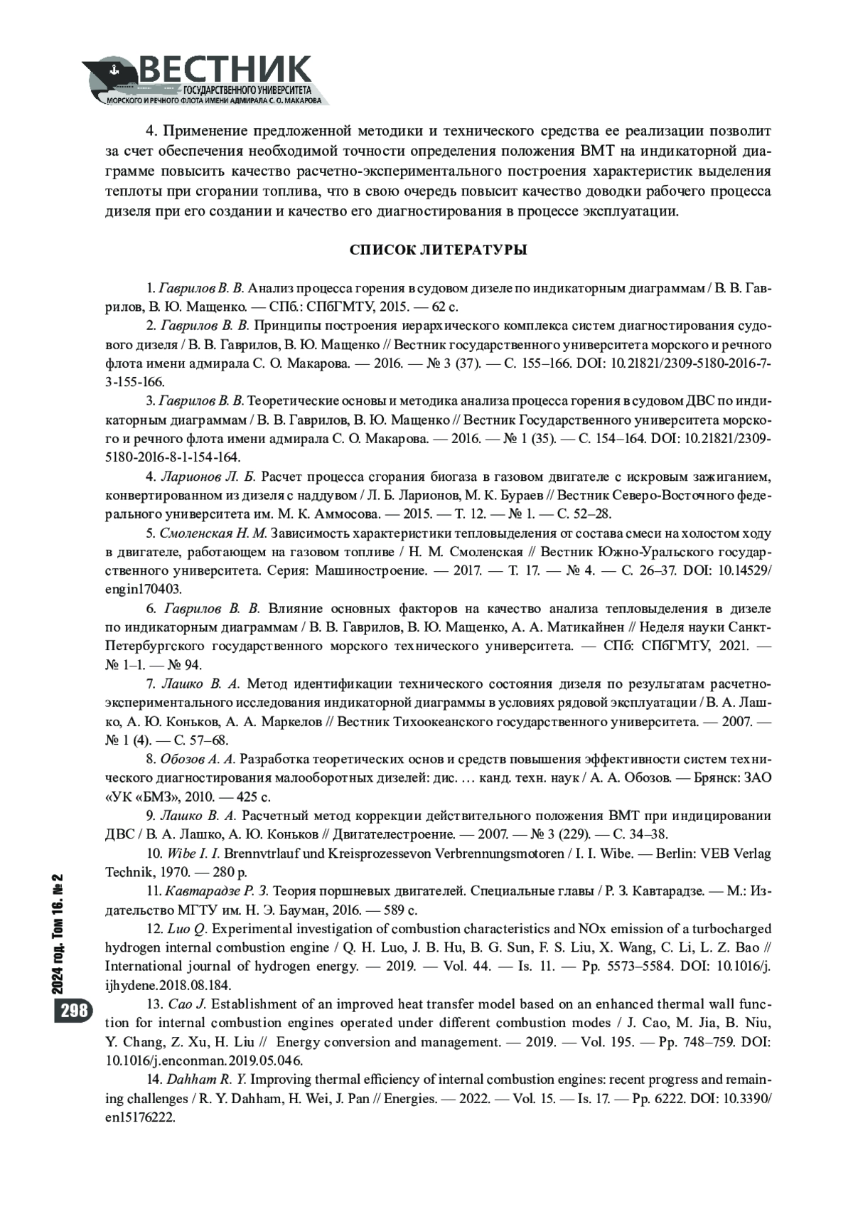 6. Гаврилов В. В. Влияние основных факторов на качество анализа тепловыделения в дизеле по индикаторным диаграммам / В. В. Гаврилов, В. Ю. Мащенко, А. А. Матикайнен // Неделя науки Санкт-Петербургского государственного морского технического университета. - СПб: СПбГМТУ, 2021. - № 1-1. - № 94.