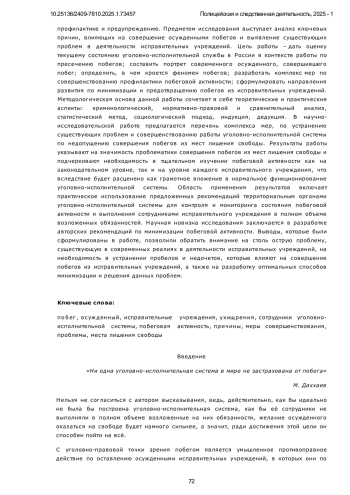 В последние годы наблюдается перманентная тенденция к снижению числа побегов из исправительных учреждений. Однако, несмотря на это, побеги по-прежнему остаются актуальной проблемой, требующей всестороннего и комплексного подхода к профилактике и предупреждению. Предметом исследования выступает анализ ключевых причин, влияющих на совершение осужденными побегов и выявление существующих проблем в деятельности исправительных учреждений. Цель работы - дать оценку текущему состоянию уголовно-исполнительной службы в России в контексте работы по пресечению побегов; составить портрет современного осужденного, совершившего побег; определить, в чем кроется феномен побегов; разработать комплекс мер по совершенствованию профилактики побеговой активности; сформулировать направления развития по минимизации и предотвращению побегов из исправительных учреждений. Методологическая основа данной работы сочетает в себе теоретические и практические аспекты: криминологический, нормативно-правовой и сравнительный анализ, статистический метод, социологический подход, индукция, дедукция. В научно-исследовательской работе предлагается перечень комплекса мер, по устранению существующих проблем и совершенствованию работы уголовно-исполнительной системы по недопущению совершения побегов из мест лишения свободы. Результаты работы указывают на значимость проблематики совершения побегов из мест лишения свободы и подчеркивают необходимость в тщательном изучении побеговой активности как на законодательном уровне, так и на уровне каждого исправительного учреждения, что вследствие будет расценено как грамотное вложение в нормальное функционирование уголовно-исполнительной системы. Область применения результатов включает практическое использование предложенных рекомендаций территориальным органами уголовно-исполнительной системы для контроля и мониторинга состояния побеговой активности и выполнения сотрудниками исправительного учреждения в полном объеме возложенных обязанностей. Научная новизна исследования заключается в разработке авторских рекомендаций по минимизации побеговой активности. Выводы, которые были сформулированы в работе, позволили обратить внимание на столь острую проблему, существующую в современных реалиях в деятельности исправительных учреждений, на необходимость в устранении пробелов и недочетов, которые влияют на совершение побегов из исправительных учреждений, а также на разработку оптимальных способов минимизации и решения данных проблем.