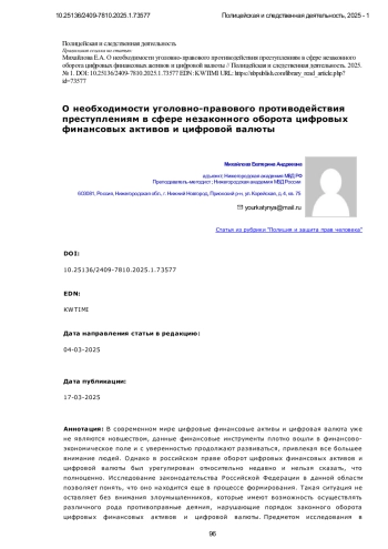 МИХАЙЛОВА Е. А. О НЕОБХОДИМОСТИ УГОЛОВНО-ПРАВОВОГО ПРОТИВОДЕЙСТВИЯ ПРЕСТУПЛЕНИЯМ В СФЕРЕ НЕЗАКОННОГО ОБОРОТА ЦИФРОВЫХ ФИНАНСОВЫХ АКТИВОВ И ЦИФРОВОЙ ВАЛЮТЫ // ПОЛИЦЕЙСКАЯ И СЛЕДСТВЕННАЯ ДЕЯТЕЛЬНОСТЬ. 2025. № 1