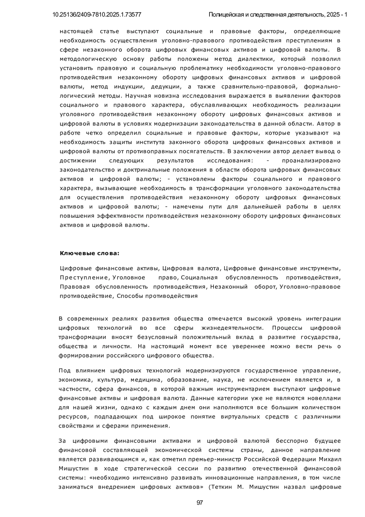 Ключевые фразы: ЦИФРОВЫЕ ФИНАНСОВЫЕ АКТИВЫ, ЦИФРОВАЯ ВАЛЮТА, цифровые финансовые инструменты, преступление, уголовное право, социальная обусловленность противодействия, правовая обусловленность противодействия, незаконный оборот, уголовно-правовое противодействие, способы противодействия