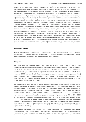 Использование «фирм-однодневок» в преступной деятельности, и особенно в сфере экономики приобрело закономерный характер. Фиктивные организации стали не только правовой, но и социальной проблемой. Предметом исследования выступает комплексный анализ современного состояния преступности, в частности касательно совершения незаконной банковской деятельности, связанной с незаконным обналичиванием и транзитированием денежных средств путем вовлечения «фирм-однодневок», а также анализ государственных регуляторов, использующихся для борьбы с данной категорией преступлений. Объектом исследования выступают непосредственно сами «фирмы-однодневки» как социальное явление, а также государственные и иные регуляторы, способствующие выявлению и пресечению их деятельности. Цель исследования - дать характеристику «фирмам-однодневкам» и выделить их основные черты, определить наиболее актуальные и значимые для правоприменительной практики проблемы в данной сфере и пути их решения. Для достижения цели использованы методы анализа, синтеза, обобщения, контент-анализа документов, сравнительный, формально-логический и системный методы. Новизна исследования обусловлена междисциплинарным подходом к рассмотрению института «фирм-однодневок», в который включается уголовно-правовой, криминологический и экономический критерий. В работе систематизированы основные признаки номинальных организаций на основе анализа правовых доктрин, судебной практики и статистки государственных органов, и как результат сформировано общее понятие «фирм-однодневок». Результатами исследования стало определение роли «фирм-однодневок» в схемах незаконной банковской деятельности, а также детальный анализ современных автоматизированных сервисов и систем, которые используются для выявления и пресечения деятельности фиктивных организаций. В работе приведены и проанализированы масштабы ущерба, причиняемого деятельностью номинальных фирм, включая прямую взаимосвязь между оборотом денежных средств в стране и долей ВВП, а также рассмотрена роль межведомственного взаимодействия при расследовании данной категории преступлений и оценена эффективность государственных регуляторов.