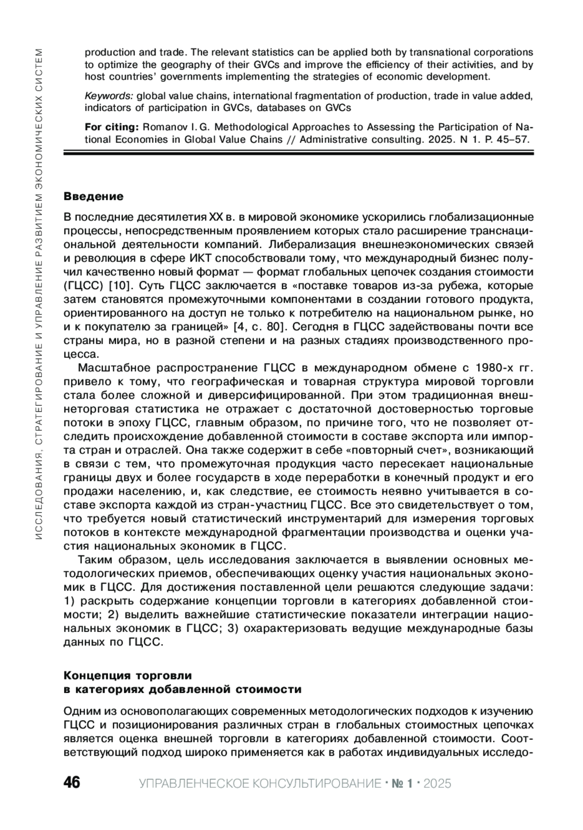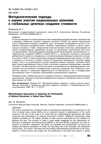 The article examines the conceptual basis of international fragmentation of production in the form of global value chains (GVCs) as an important feature of globalization of the world economy. The aim of the study is to reveal the key methodological approaches that allow measuring the participation of national economies in GVCs. Traditional international trade statistics published on the o cial websites of state customs authorities are not su cient to address this task. The concept of trade in value added suggested by the Organization for Economic Cooperation and Development (OECD) in the early 2010s is analyzed, the main indicators of countries’ integration into GVCs are identi ed and systematized, as well as the leading international databases on GVCs are described with their strengths and drawbacks being shown. The author concludes that the existing methodological approaches to the investigation of GVCs provide new insight into the positioning of countries and regions in global production and trade. The relevant statistics can be applied both by transnational corporations to optimize the geography of their GVCs and improve the e ciency of their activities, and by host countries’ governments implementing the strategies of economic development.