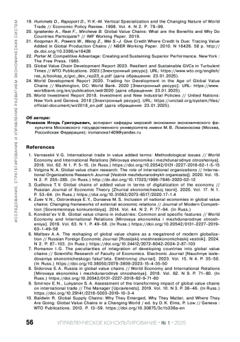 6. Мальцев А. А. Реконфигурация глобальных цепочек создания стоимости как мегатренд современной глобализации // Российский внешнеэкономический вестник. 2024. № 2. С. 87-103. DOI: 10.24412/2072-8042-2024-2-87-103 EDN: VDZVTR