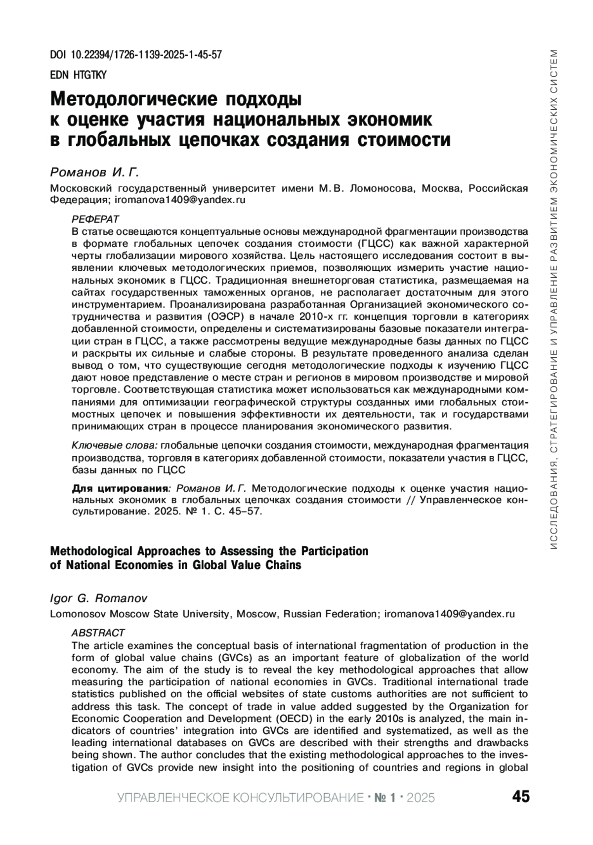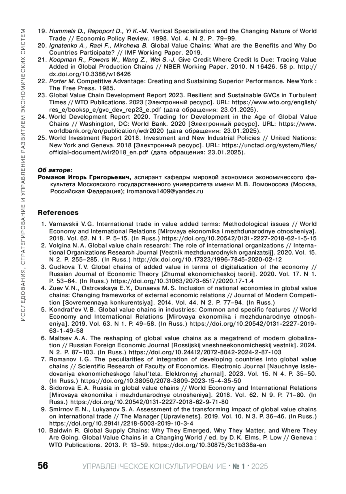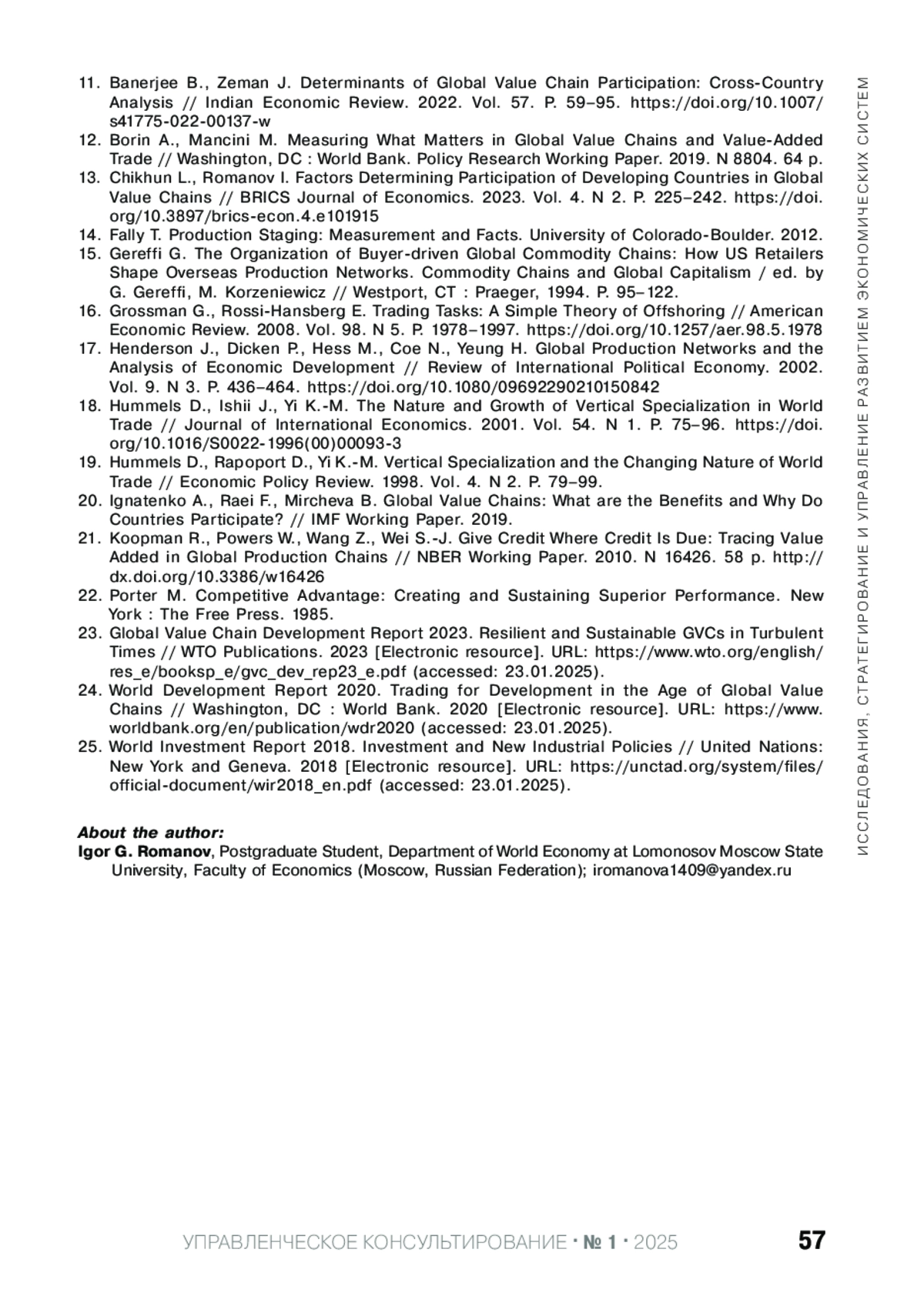 13. Chikhun L., Romanov I. Factors Determining Participation of Developing Countries in Global Value Chains // BRICS Journal of Economics. 2023. Vol. 4. N 2. P. 225-242. DOI: 10.3897/brics-econ.4.e101915 EDN: UCJUWD