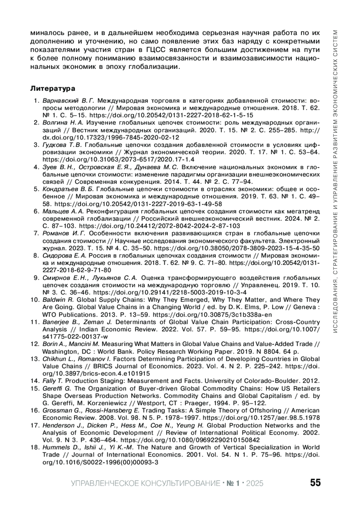 2. Волгина Н. А. Изучение глобальных цепочек стоимости: роль международных организаций // Вестник международных организаций. 2020. Т. 15. № 2. С. 255-285. DOI: 10.17323/1996-7845-2020-02-12 EDN: RARPXX