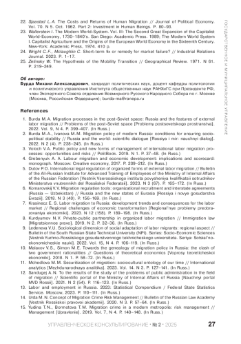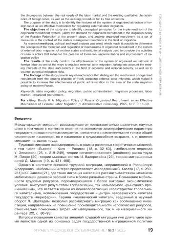 The relevance of the research topic is that external labor migration remains one of the most significant areas of regulation of the state migration policy of the Russian Federation. This is due to the discrepancy between the real needs of the labor market and the existing qualitative characteristics of foreign labor, as well as the existing procedure for its free attraction. The purpose of the study is to identify the features of the system of organized attraction of foreign labor as an effective mechanism for regulating external labor migration. The objectives of the study are to identify conceptual principles for the implementation of the organized recruitment system, justify the demand for organized recruitment in the migration policy of the Russian Federation at the present stage, and analyze organized recruitment as a set of measures in the context of the state’s management functions in the field of migration. As research methods, political and legal analysis was used, which made it possible to determine the principles of the formation and regulation of mechanisms of organized recruitment in the system of external labor migration of modern states and institutional analysis used to consider the activities of various actors that influence the process of formation, implementation and improvement of migration policy. The results of the study confirm the effectiveness of the system of organized recruitment of foreign labor as one of the ways to regulate external labor migration, taking into account the existing interests of the state and society in the field of economy and national security, as well as to counter potential migration risks. The findings of the study provide key characteristics that distinguish the mechanism of organized recruitment from the existing practice of freely attracting external labor migrants, which makes it possible to increase the effectiveness of public administration in this area of the state migration policy of modern Russia.