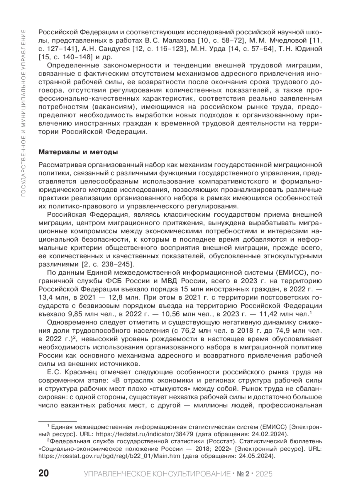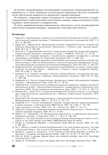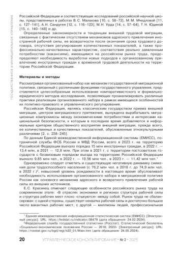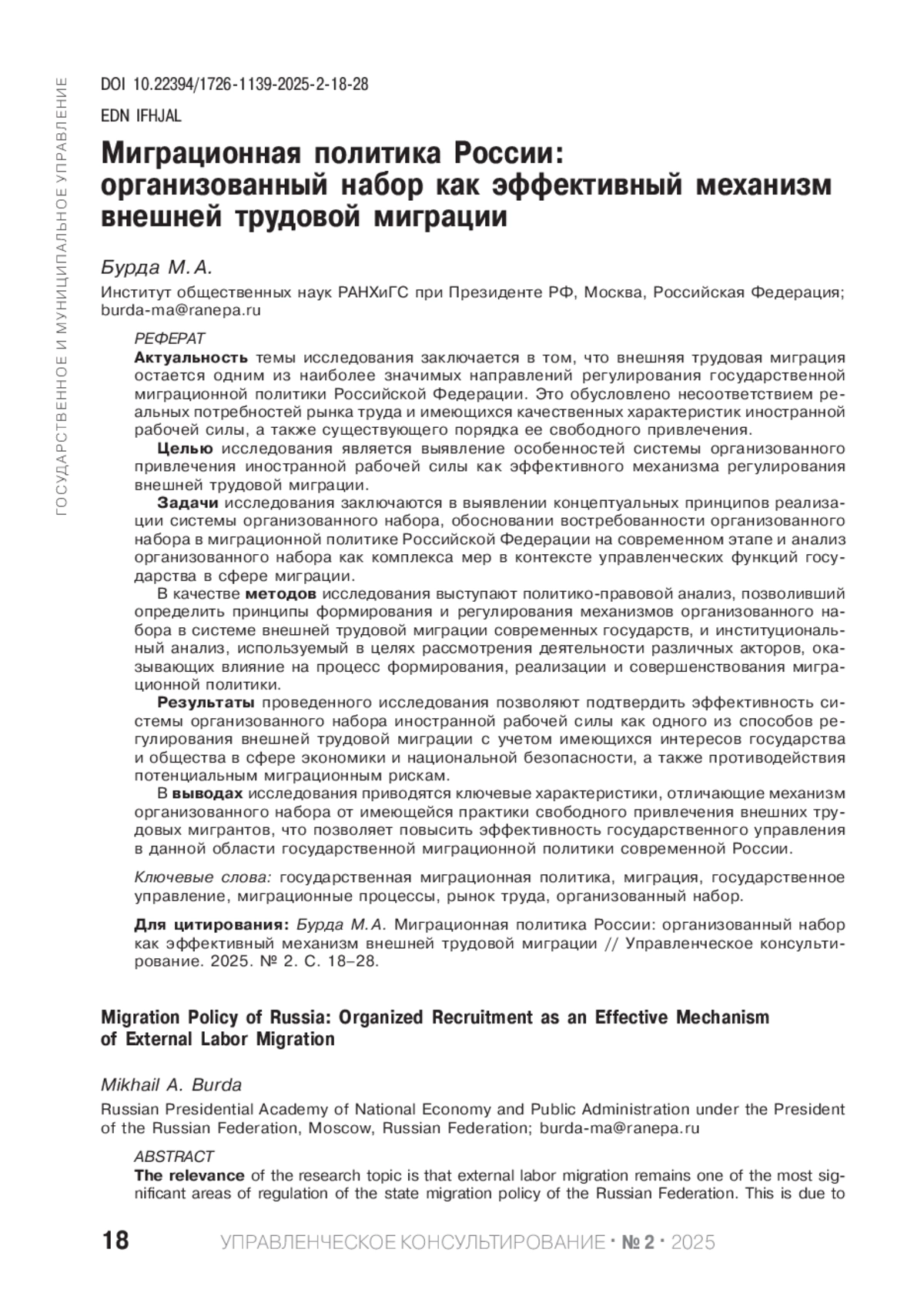 Актуальность темы исследования заключается в том, что внешняя трудовая миграция остается одним из наиболее значимых направлений регулирования государственной миграционной политики Российской Федерации. Это обусловлено несоответствием реальных потребностей рынка труда и имеющихся качественных характеристик иностранной рабочей силы, а также существующего порядка ее свободного привлечения. Целью исследования является выявление особенностей системы организованного привлечения иностранной рабочей силы как эффективного механизма регулирования внешней трудовой миграции. Задачи исследования заключаются в выявлении концептуальных принципов реализации системы организованного набора, обосновании востребованности организованного набора в миграционной политике Российской Федерации на современном этапе и анализ организованного набора как комплекса мер в контексте управленческих функций государства в сфере миграции. В качестве методов исследования выступают политико-правовой анализ, позволивший определить принципы формирования и регулирования механизмов организованного набора в системе внешней трудовой миграции современных государств, и институциональный анализ, используемый в целях рассмотрения деятельности различных акторов, оказывающих влияние на процесс формирования, реализации и совершенствования миграционной политики. Результаты проведенного исследования позволяют подтвердить эффективность системы организованного набора иностранной рабочей силы как одного из способов регулирования внешней трудовой миграции с учетом имеющихся интересов государства и общества в сфере экономики и национальной безопасности, а также противодействия потенциальным миграционным рискам. В выводах исследования приводятся ключевые характеристики, отличающие механизм организованного набора от имеющейся практики свободного привлечения внешних трудовых мигрантов, что позволяет повысить эффективность государственного управления в данной области государственной миграционной политики современной России.