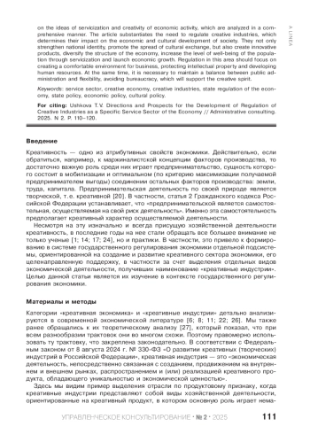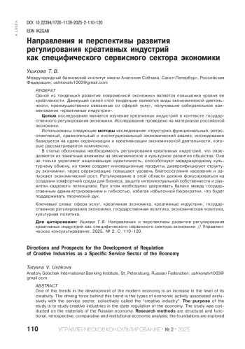 One of the trends in the development of the modern economy is an increase in the level of its creativity. The driving force behind this trend is the types of economic activity associated exclusively with the service sector, collectively called the “creative industry”. The purpose of the study is to study creative industries in the state regulation of the economy. The study was conducted on the materials of the Russian economy. Research methods are structural and functional, retrospective, comparative and institutional economic analysis; the foundations are explored on the ideas of servicization and creativity of economic activity, which are analyzed in a comprehensive manner. The article substantiates the need to regulate creative industries, which determines their impact on the economic and cultural development of society. They not only strengthen national identity, promote the spread of cultural exchange, but also create innovative products, diversify the structure of the economy, increase the level of well-being of the population through servicization and launch economic growth. Regulation in this area should focus on creating a comfortable environment for business, protecting intellectual property and developing human resources. At the same time, it is necessary to maintain a balance between public administration and flexibility, avoiding bureaucracy, which will support the creative spirit.