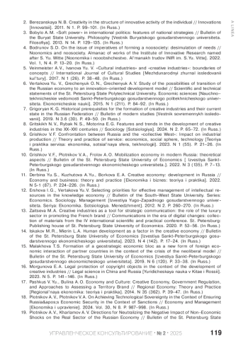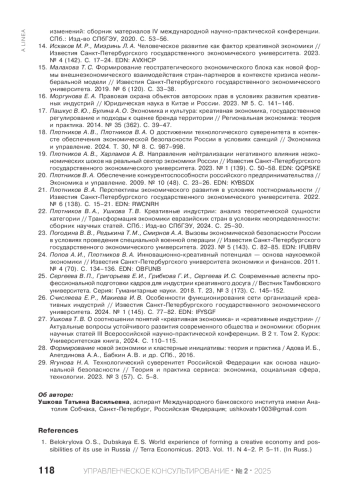 27. Ушкова Т. В. О соотношении понятий “креативная экономика” и “креативные индустрии” // Актуальные вопросы устойчивого развития современного общества и экономики: сборник научных статей III Всероссийской научно-практической конференции. В 2 т. Том 2. Курск: Университетская книга, 2024. С. 110-115. EDN: QHMYPQ