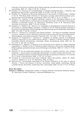 22. Плотников В. А., Ушкова Т. В. Креативные индустрии: анализ теоретической сущности категории // Трансформация экономики евразийских стран в условиях неопределенности: сборник научных статей. СПб.: Изд-во СПбГЭУ, 2024. С. 25-30. EDN: PHJSSU