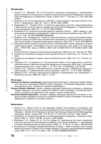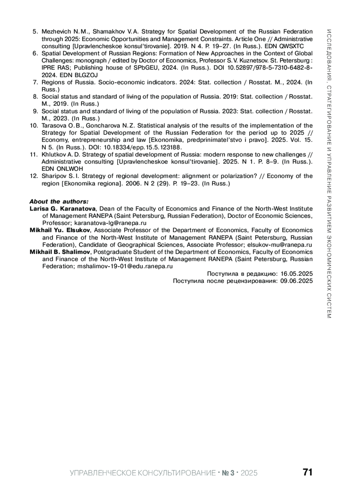 5. Межевич Н. М., Шамахов В. А. Стратегия пространственного развития Российской Федерации на период до 2025 года: экономические возможности и управленческие ограничения. Статья первая // Управленческое консультирование. 2019. № 4. С. 19-27. EDN: QWSXTC