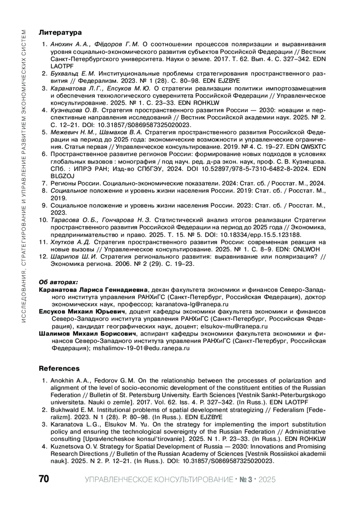 1. Анохин А. А., Фёдоров Г. М. О соотношении процессов поляризации и выравнивания уровня социально-экономического развития субъектов Российской Федерации // Вестник Санкт-Петербургского университета. Науки о земле. 2017. Т. 62. Вып. 4. С. 327-342. EDN: LAOTPF