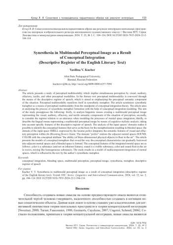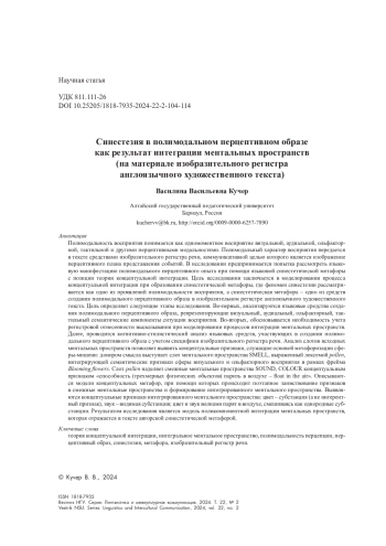 Цель исследования заключается в моделировании процесса концептуальной интеграции при образовании синестетической метафоры, где феномен синестезии рассматривается как одно из проявлений полимодальности восприятия, а синестетическая метафора – одно из средств создания полимодального перцептивного образа в изобразительном регистре англоязычного художественного текста.