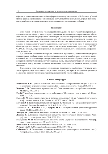 1. Бардовская А. И. Средства номинации синестетических соощущений (на материале русских и английских художественных текстов) : Дис. … канд. филол. наук. Тверь, 2005. 178 с.