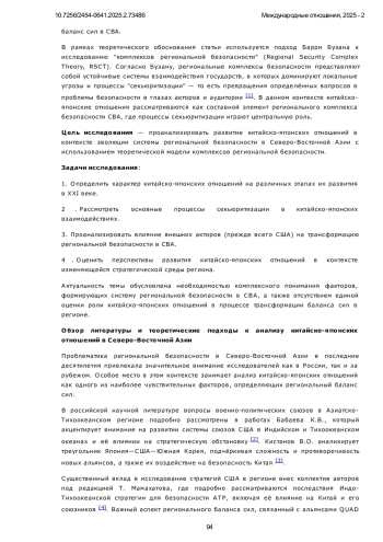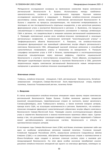 Предметом исследования являются китайско-японские отношения в контексте региональной безопасности. Для того, чтобы обеспечить глубину исследования, необходимо изучить предмет с разных сторон: 1. Геополитическое соперничество: Изучить геополитические устремления Китая и Японии в Северо-Восточной Азии, включая их основные цели и стратегии в регионе. 2. Региональная безопасность: Оценить роль Китая и Японии в формировании региональной безопасности, учитывая их участие в международных организациях и альянсах. 3. Территориальные споры: Проанализировать влияние территориальных конфликтов, таких как спор об островах Сенкаку/Дяоюйдао, на отношения между странами и региональную безопасность. 4. Внешние факторы: Изучить влияние внешних факторов (например, США) на китайско-японские отношения в контексте региональной безопасности. Методология исследования основана на применении элементов теории комплексов региональной безопасности Б. Бузана. Использованы методы проблемно-хронологического, системного и сравнительного подходов. Научная новизна исследования заключается в следующем: 1. Впервые китайско-японские отношения рассмотрены сквозь призму концепции «комплексов региональной безопасности» Б. Бузана с акцентом на процессы секьюритизации, что позволяет интерпретировать их эволюцию не как последовательность отдельных инцидентов, а как целостную динамику формирования угроз и восприятия безопасности в регионе. 2. Выявлено, что процессы секьюритизации в китайско-японских отношениях усиливаются в периоды активизации США в регионе, что свидетельствует о внешнем катализе региональной напряженности. 3. Проведён комплексный анализ роли китайско-японских противоречий в эскалации региональных конфликтов, с применением категорий “экзистенциальной угрозы” и “референциального объекта безопасности”. 4. Показано, что китайско-японские отношения функционируют как важнейший субкомплекс внутри общего регионального комплекса безопасности СВА, обладающий высокой степенью автономии и способный самостоятельно генерировать угрозы и механизмы их преодоления. 5. Раскрыта специфика восприятия угроз в КНР и Японии, проявляющаяся в институционализации процессов секьюритизации через военные реформы, стратегии национальной безопасности и участие в многосторонних инициативах. Таким образом, исследование обогащает существующие научные подходы к изучению безопасности в СВА, дополняя теоретическую модель комплексов региональной безопасности новым эмпирическим материалом о динамике китайско-японских взаимодействий.