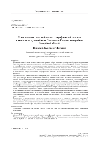 Целью настоящей статьи является введение в научный оборот и анализ географической лексики и топонимии, бытующих в среде чувашского населения села Смолькино Сызранского района Самарской области. Топонимия и географическая лексика смолькинского говора чувашского языка до настоящего времени не подвергались комплексному изучению, между тем они представляют значительный интерес в связи с языковыми особенностями чувашей села Смолькино. В статье ставилась задача провести лексико-семантический анализ бытующих в смолькинском говоре топонимии и географической лексики с целью выявления их характеристических особенностей.