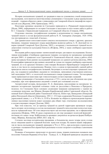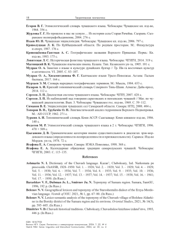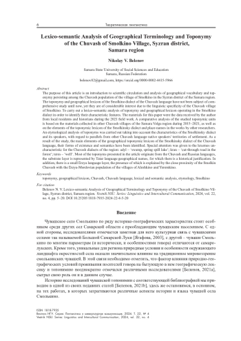 4. Беленов Н. В. Лексико-семантический анализ топонимии чувашского села Большое Алдаркино Борского района Самарской области и его окрестностей // Oriental Studies. 2021. № 14(3). С. 595-605.