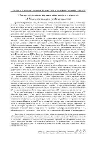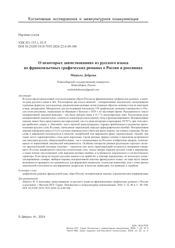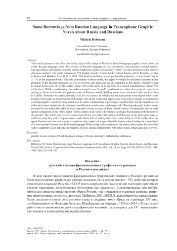 В статье представлен новый этап исследования образа России во франкоязычных графических романах, а именно роль русского языка в них. Рассмотрены два класса явлений – ненормативные лексические заимствования и речевые формулы, используемые для реализации речевых актов (главным образом «клятва») или их имитации в виде дискурсивов. Материалом для исследования послужили 550 графических романов («комиксов») о России и/или россиянах, написанных во Франции и Бельгии с 1929 г. по настоящее время. Насыщенность текста ненормативной лексикой невелика – она была найдена лишь в 11,7 % анализируемых книг. Рассмотрена роль ненормативной лексики в них, степень ее освоения русским языком, типы и функционирование. Ненормативная лексика может быть представлена как кириллицей, так и в транслитерации в пропорции 30/70 %, при этом авторы прибегают, скорее, к «бытовой», чем к научной транслитерации, стараясь приблизиться к реальному произношению русских слов. В словах, написанных кириллицей, нередки орфографические ошибки. Ненормативная лексика переведена лишь в 15,6 % случаев, переводы могут быть как внизу панели, так и внизу страницы. Не все слова и выражения используются в качестве оскорблений или выражения ярких отрицательных эмоций, они также могут характеризовать стиль речи персонажа. Среди речевых формул клятвы и проклятия встречаются как имитации русских общеупотребительных, так и «намекающие на Россию» изобретения авторов, отличающиеся от нормативной лексической наполняемости. Особенно интересна речевая реализация «третьего актанта» прагматической ситуации «клятвы» – свидетель или залог, гарантирующий истинность намерения говорящего. В статье выдвигаются гипотезы относительно того, откуда авторы черпают русские слова и выражения, а также почему они позволяют себе нередкие речевые ошибки, в особенности лексического и стилистического характера. Если автор не владеет русским языком и не прибегает к помощи переводчика, он использует специализированные словари: выбирая перевод ненормативной лексемы французского языка, он чаще всего лишен возможности проверить его адекватность для выражения экспрессии, в качестве инвективы, или с точки зрения лексической сочетаемости для выражения экспрессии, в качестве инвективы, что приводит к ошибкам.