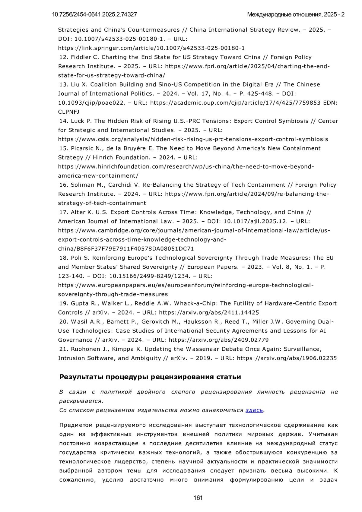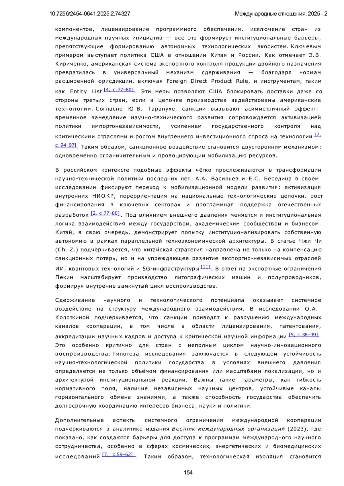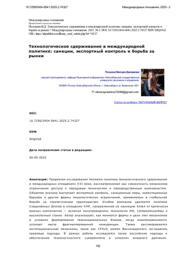 ПОЛУХИНА В. Д. ТЕХНОЛОГИЧЕСКОЕ СДЕРЖИВАНИЕ В МЕЖДУНАРОДНОЙ ПОЛИТИКЕ: САНКЦИИ, ЭКСПОРТНЫЙ КОНТРОЛЬ И БОРЬБА ЗА РЫНКИ // МЕЖДУНАРОДНЫЕ ОТНОШЕНИЯ. 2025. № 2