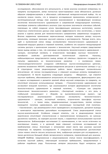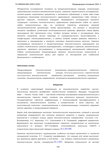 Ключевые фразы: международная технологическая конкуренция, внешнеполитическая стратегия, международные экономические санкции, технонационализм, СТРАТЕГИЧЕСКАЯ КОНКУРЕНЦИЯ, технологический суверенитет, экспортный контроль, санкционная политика, технологическое сдерживание, инструменты внешнеполитического давления
