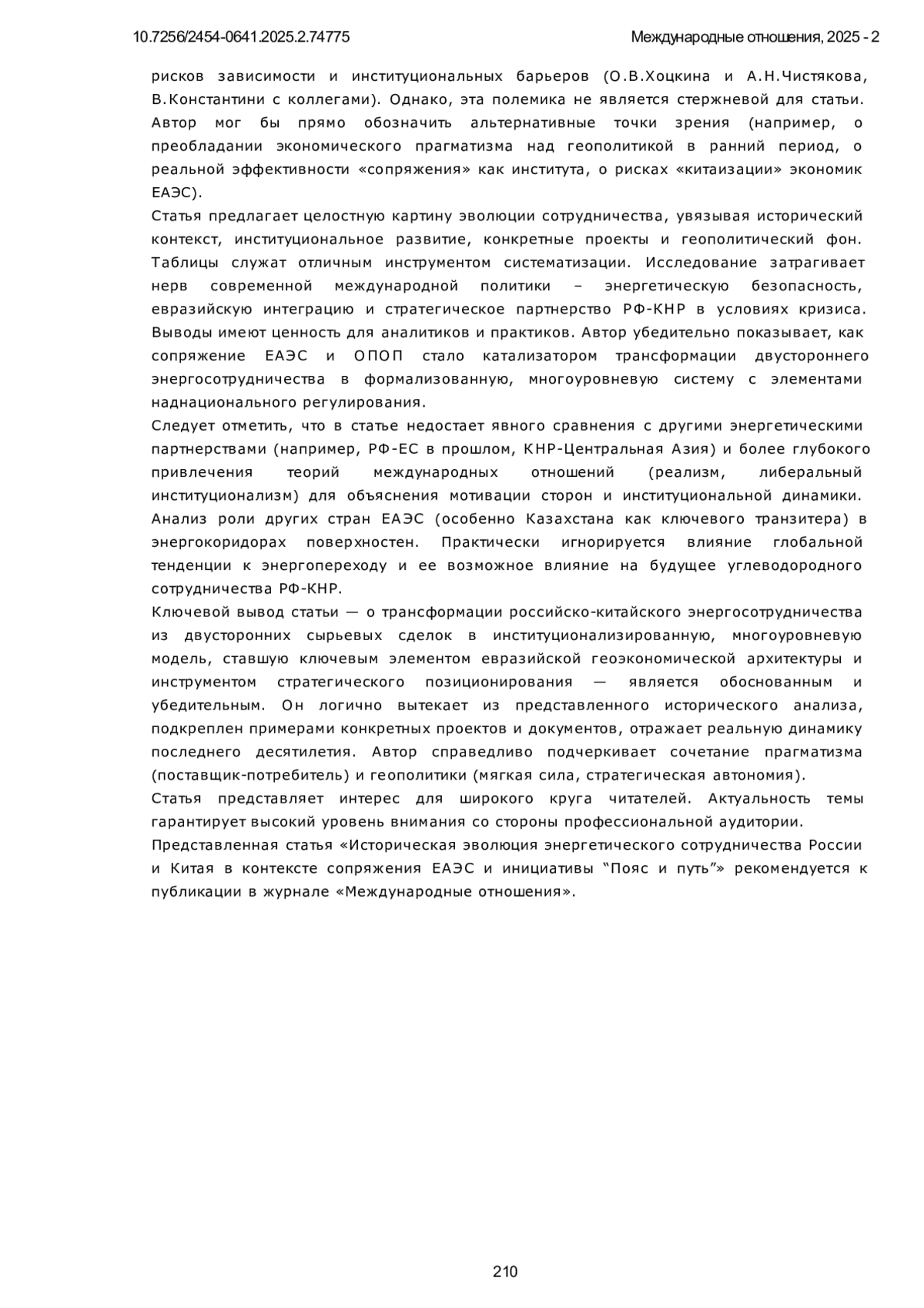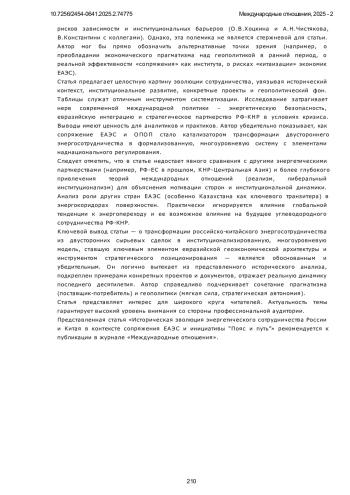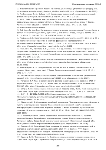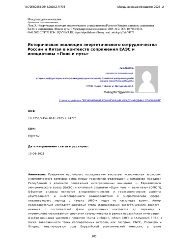 ЛУНЬ Х. ИСТОРИЧЕСКАЯ ЭВОЛЮЦИЯ ЭНЕРГЕТИЧЕСКОГО СОТРУДНИЧЕСТВА РОССИИ И КИТАЯ В КОНТЕКСТЕ СОПРЯЖЕНИЯ ЕАЭС И ИНИЦИАТИВЫ «ПОЯС И ПУТЬ» // МЕЖДУНАРОДНЫЕ ОТНОШЕНИЯ. 2025. № 2
