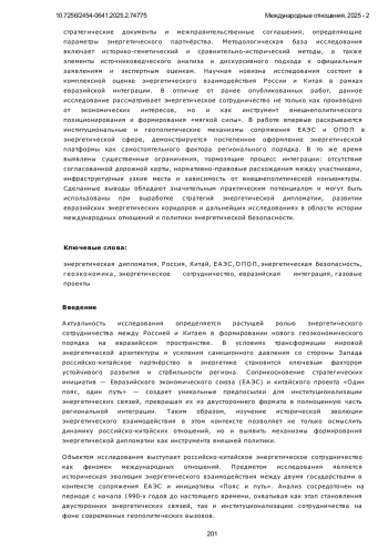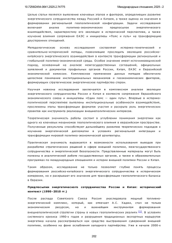 Предметом настоящего исследования выступает историческая эволюция энергетического сотрудничества между Российской Федерацией и Китайской Народной Республикой в контексте сопряжения интеграционных инициатив - Евразийского экономического союза (ЕАЭС) и китайской стратегии «Один пояс - один путь» (ОПОП). Объектом анализа являются внешнеполитические и геоэкономические аспекты двустороннего и многостороннего взаимодействия в энергетической сфере, охватывающего период с начала 1990-х годов по настоящее время. Автор последовательно исследует ключевые этапы формирования энергетического диалога, начиная с постсоветской фазы двусторонних контрактов до перехода к институционализированным форматам сотрудничества в рамках евразийской интеграции. Особое внимание уделяется проектам «Сила Сибири», «Ямал СПГ» и «Амурский ГПЗ», а также вовлечённости таких корпоративных акторов, как Газпром, CNPC, Роснефть и Sinopec. Анализируется роль Евразийской экономической комиссии, а также стратегические документы и межправительственные соглашения, определяющие параметры энергетического партнёрства. Методологическая база исследования включает историко-генетический и сравнительно-исторический методы, а также элементы источниковедческого анализа и дискурсивного подхода к официальным заявлениям и экспертным оценкам. Научная новизна исследования состоит в комплексной оценке энергетического взаимодействия России и Китая в рамках евразийской интеграции. В отличие от ранее опубликованных работ, данное исследование рассматривает энергетическое сотрудничество не только как производно от экономических интересов, но и как инструмент внешнеполитического позиционирования и формирования «мягкой силы». В работе впервые раскрываются институциональные и геополитические механизмы сопряжения ЕАЭС и ОПОП в энергетической сфере, демонстрируется постепенное оформление энергетической платформы как самостоятельного фактора регионального порядка. В то же время выявлены существенные ограничения, тормозящие процесс интеграции: отсутствие согласованной дорожной карты, нормативно-правовые расхождения между участниками, инфраструктурные узкие места и зависимость от внешнеполитической конъюнктуры. Сделанные выводы обладают значительным практическим потенциалом и могут быть использованы при выработке стратегий энергетической дипломатии, развитии евразийских энергетических коридоров и дальнейших исследованиях в области истории международных отношений и политики энергетической безопасности.