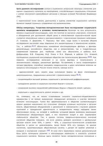 В условиях современных вызовов и «внешних» угроз выявление механизмов консолидации общества становится одним из критически важных направлений научного поиска в области социального управления и совершенствования общественных отношений. В свою очередь, необходимость данного поиска инициирует исследование такого объекта как социальный капитал. Поскольку именно его природа и элементы структуры в значительной степени способствуют объединительным процессам и поддержанию порядка в обществе. Так, один из основных теоретиков социального капитала Ф. Фукуяма, в базисе стабильности и благополучия современных обществ, наряду с рациональными элементами договора и экономической целесообразности выделяет именно ответственность, способность к взаимодействию, доверие, моральное обязательство как залог успешного развития [1]. Кроме того, использование категории социального капитала при анализе текущего развития российского общества становится необходимой задачей, отвечающей целям многостороннего выявления перспектив и ориентиров, включая выделение социальных ресурсов или неэкономических факторов дальнейшего развития российского социума и его консолидации. Функции социального капитала разнообразны. Однако, применительно к анализу макроуровня его существования, в приоритете выступает рассмотрение его реализации в функции социальной интеграции – сплочения общества, обеспечения возможности объединения для достижения и реализации общественно важных задач и благ. При этом, для интенсификации социального капитала на макроуровне качество самой институциональной среды имеет решающее значение.