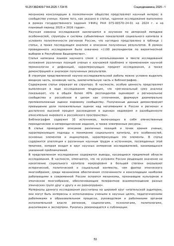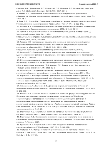 16. Каримов А.Г. Некоторые аспекты диагностики социального капитала региона в условиях социально-экономической нестабильности. // Социодинамика. 2023. № 12. С. 118-132. 10.25136/2409-7144.2023.12.69174 URL: https://e-notabene.ru/pr/article_69174.html. DOI: 10.25136/2409-7144.2023.12.69174URL