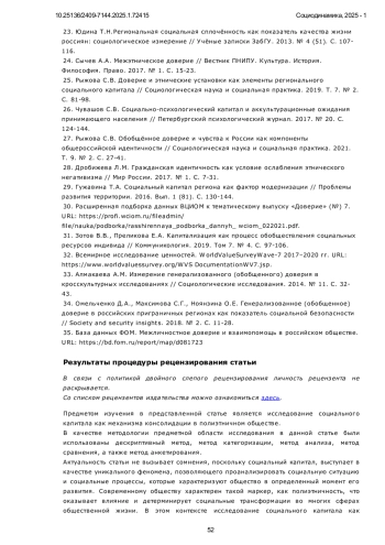 25. Рыжова С.В. Доверие и этнические установки как элементы регионального социального капитала // Социологическая наука и социальная практика. 2019. Т. 7. № 2. С. 81-98.