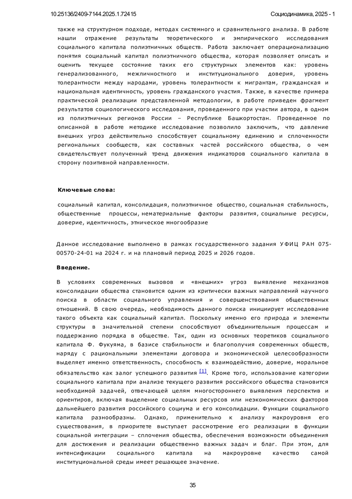 В условиях современных вызовов и «внешних» угроз, выявление механизмов консолидации общества становится одним из критически важных направлений научного поиска. В свою очередь, это инициирует исследование такого объекта как социальный капитал. Поскольку именно его природа и элементы структуры в значительной степени способствуют объединительным процессам и поддержанию порядка в обществе. Цель исследования состоит в выявлении теоретико-методологических основ и актуальной структуры элементов для оценки социального капитала на макроуровне с учетом этнического разнообразия регионов и текущих условий России. Выделены базовые теории и их ведущие положения, имеющие основополагающее значение относительно исследования социального капитала макроуровня. Значительное внимание отведено выделению традиций и основных положения российских исследований социального капитала, обладающих теоретико-методологическим потенциалом для его исследования в региональных социумах с учетом особенностей функционирования применительно к условиям России. Работа основана на применении общенаучных методов, в том числе, синтеза и обобщения, а также на структурном подходе, методах системного и сравнительного анализа. В работе нашли отражение результаты теоретического и эмпирического исследования социального капитала полиэтничных обществ. Работа заключает операционализацию понятия социальный капитал полиэтничного общества, которая позволяет описать и оценить текущее состояние таких его структурных элементов как: уровень генерализованного, межличностного и институционального доверия, уровень толерантности между народами, уровень толерантности к мигрантам, гражданская и национальная идентичность, уровень гражданского участия. Также, в качестве примера практической реализации представленной методологии, в работе приведен фрагмент результатов социологического исследования, проведенного при участии автора, в одном из полиэтничных регионов России - Республике Башкортостан. Проведенное по описанной в работе методике исследование позволило заключить, что давление внешних угроз действительно способствует социальному единению и сплоченности региональных сообществ, как составных частей российского общества, о чем свидетельствует полученный тренд движения индикаторов социального капитала в сторону позитивной направленности.