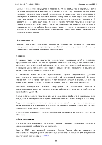 С каждым годом растет количество пользователей социальных сетей в Интернете, представляющих собой не только средства коммуникации между пользователями и получения ими необходимой информации, но и средством политической коммуникации. Последние десять лет политические партии наращивают свое присутствие в социальных сетях транслируя политическую повестку. В настоящее время проблематично оценить эффективность действия коммуникации на пользователей социальных сетей политической повесткой. Не ясным становится вопрос, какое место занимает политическая агитация в социальных сетях на фоне других видов агитации, включая агитацию в средствах массовой информации. Гипотезой исследования является утверждение, что политическая агитация в социальных сетях влияет на принятие решения избирателя за кого отдать свой голос на выборах Президента РФ. Методология исследования включает: метод контент-анализа, сравнительный анализ, а также метод сравнения и метод вторичного анализа данных. Целью работы является получение данных о воздействии кандидатов в Президенты РФ на сообщества в социальных сетях во время избирательной кампании на выборах в 2024 году. Задачами исследования являются: изучение политической коммуникации в социальных сетях кандидатов в президенты и влияние на принятие решения избирателя за кого отдать свой голос в день голосования. Исследование проводится в период агитационной кампании с 17 февраля по 15 марта 2024 года. Новизной работы является получение конкретных данных, на основе которых сделан вывод об эффективности политической агитации в социальных сетях на выборах федерального уровня в России, в результате которого гипотеза о воздействии политической коммуникации в социальных сетях в агитационный период не подтвердилась.