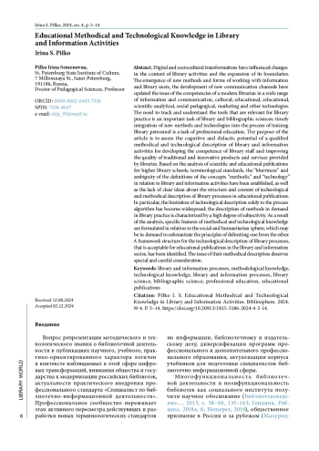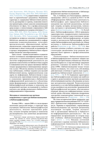 Изменения содержания библиотечной деятельности и расширение ее границ под влиянием цифровых и социокультурных трансформаций, появление новых методов и форм работы с информацией и пользователями библиотек, развитие новых каналов коммуникации актуализировали вопрос о компетенциях современного библиотекаря в широком спектре информационно-коммуникационных, культурно-просветительских, образовательных, научно-аналитических, социально-педагогических, маркетинговых и иных технологий. Необходимость отслеживания и осмысления актуального для библиотечной практики инструментария – важная задача библиотековедения и библиографоведения, своевременная интеграция новых методов и технологий в процесс подготовки библиотечных кадров – задача профессионального образования.