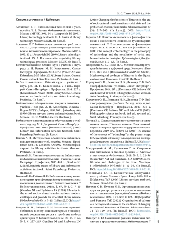 9. Гендина Н. И., Рябцева Л. Н. Библиотеки в эпоху социокультурных трансформаций: современные вызовы и основания доказательного библиотековедения // Библиотековедение. 2018а. Т. 67, № 1. С. 7-15. https://doi.org/10.25281/0869-608X-2018-67-1-7-15.