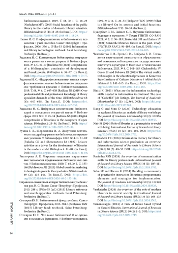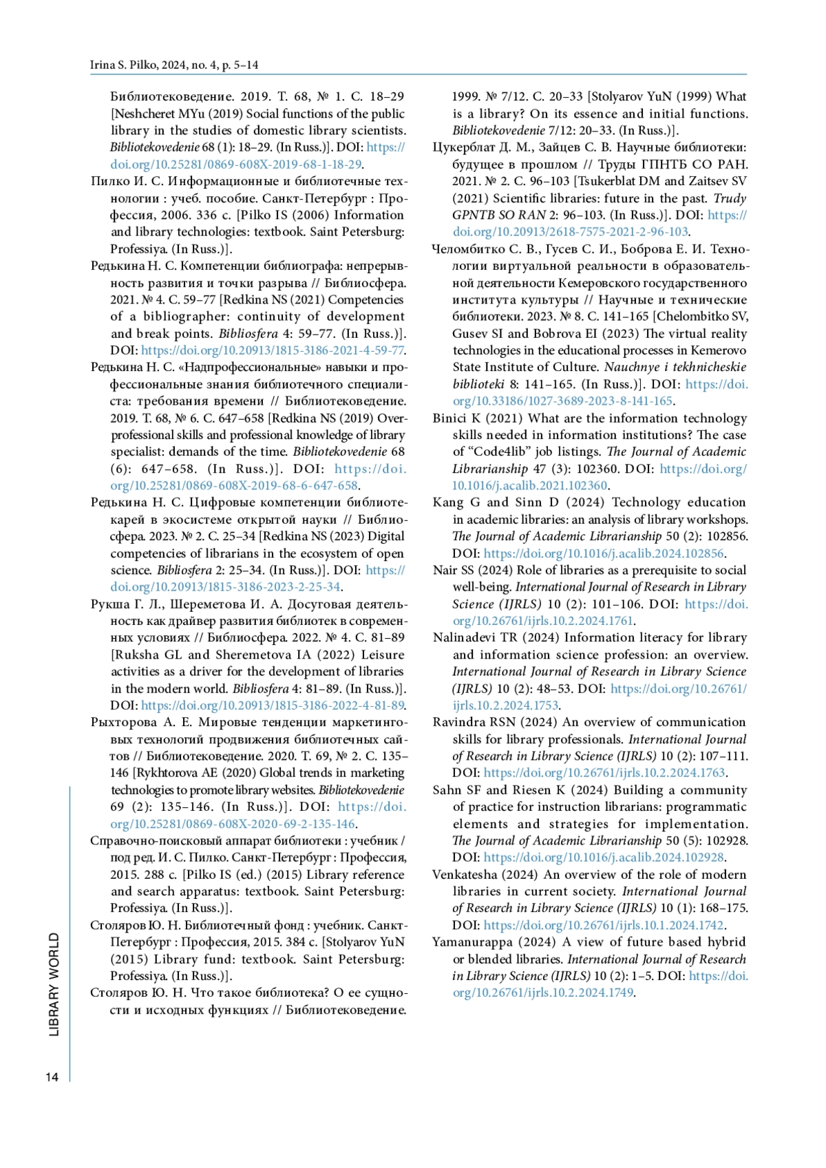 22. Редькина Н. С. «Надпрофессиональные» навыки и профессиональные знания библиотечного специалиста: требования времени // Библиотековедение. 2019. T. 68, № 6. С. 647-658. https://doi.org/10.25281/0869-608X-2019-68-6-647-658.