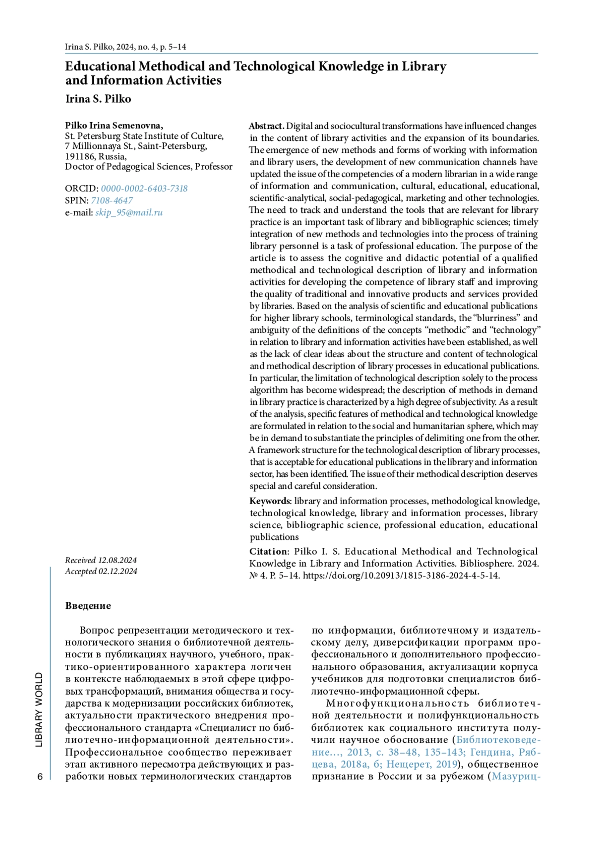 Цель статьи – оценить когнитивный и дидактический потенциал квалифицированного методического и технологического описания библиотечно-информационной деятельности для развития компетентности библиотечных кадров и повышения качества предоставляемых библиотеками традиционных и инновационных продуктов и услуг. Анализ научных публикаций, учебных изданий для высшей библиотечной школы, терминологических стандартов позволил установить размытость и семантическую неоднозначность дефиниций «методика» и «технология» применительно к библиотечно-информационной деятельности, выявить отсутствие четких представлений о структуре и содержательном наполнении технологического и методического описания библиотечных процессов в учебных изданиях. В частности, в профессиональной литературе распространено ограничение технологического описания исключительно алгоритмом процесса, а изложению востребованных библиотечной практикой методик присуща высокая доля субъективизма.
