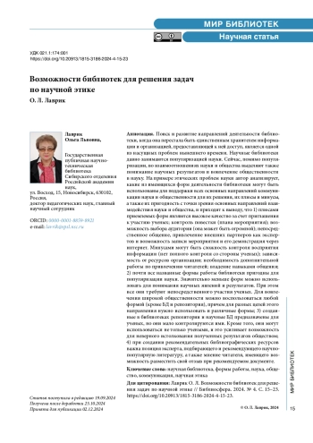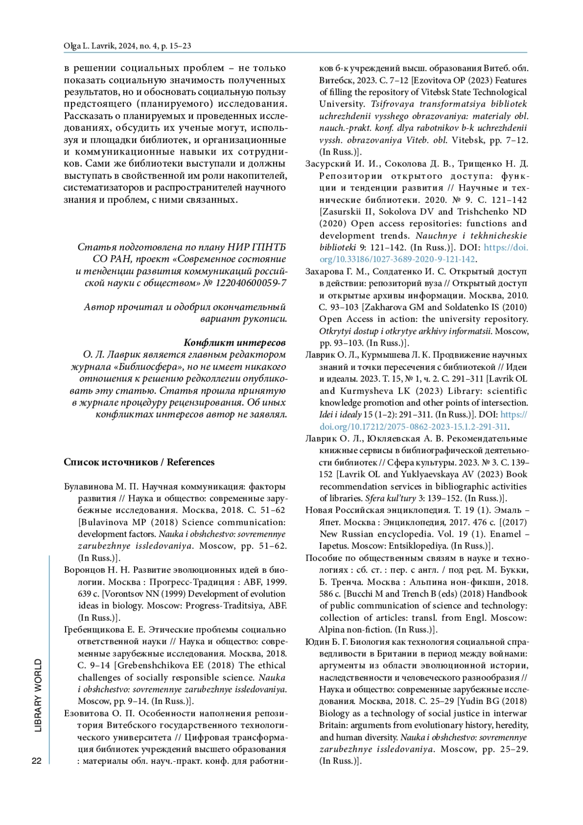 7. Лаврик О. Л., Курмышева Л. К. Продвижение научных знаний и точки пересечения с библиотекой // Идеи и идеалы. 2023. Т. 15, № 1, ч. 2. С. 291-311. https://doi.org/10.17212/2075-0862-2023-15.1.2-291-311.