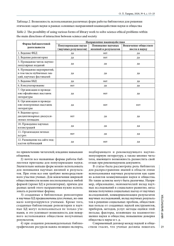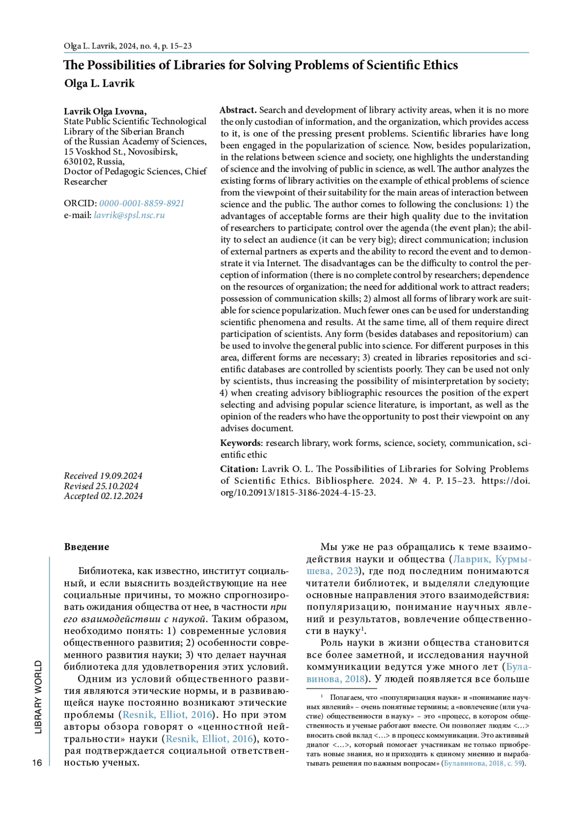 Поиск и развитие направлений деятельности библиотеки, когда она перестала быть единственным хранителем информации и организацией, предоставляющей к ней доступ, является одной из насущных проблем нынешнего времени. Научные библиотеки давно занимаются популяризацией науки. Сейчас, помимо популяризации, во взаимоотношениях науки и общества выделяют также понимание научных результатов и вовлечение общественности в науку. На примере этических проблем науки автор анализирует, какие из имеющихся форм деятельности библиотеки могут быть использованы для поддержки всех основных направлений коммуникации науки и общественности для их решения, их плюсы и минусы, а также их пригодность с точки зрения основных направлений взаимодействия науки и общества, и приходит к выводу, что 1) плюсами приемлемых форм являются высокое качество за счет приглашения к участию ученых; контроль повестки (плана мероприятия); возможность выбора аудитории (она может быть огромной); непосредственное общение, привлечение внешних партнеров как экспертов и возможность записи мероприятия и его демонстрация через интернет. Минусами могут быть сложность контроля восприятия информации (нет полного контроля со стороны ученых); зависимость от ресурсов организации; необходимость дополнительной работы по привлечению читателей; владение навыками общения; 2) почти все названные формы работы библиотеки пригодны для популяризации науки. Значительно меньше форм можно использовать для понимания научных явлений и результатов. При этом все они требуют непосредственного участия ученых. Для вовлечения широкой общественности можно воспользоваться любой формой (кроме БД и репозитория), причем для разных целей этого направления нужно использовать и различные формы; 3) созданные в библиотеках репозитории и научные БД предназначены для ученых, но они мало контролируются ими. Кроме того, они могут использоваться не только учеными, и это усиливает возможность для неверного истолкования полученных результатов обществом; 4) при создании рекомендательных библиографических ресурсов важна позиция эксперта, подбирающего и рекомендующего научнопопулярную литературу, а также мнение читателя, имеющего возможность разместить свой отзыв при рекомендуемом документе.