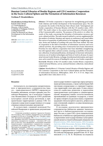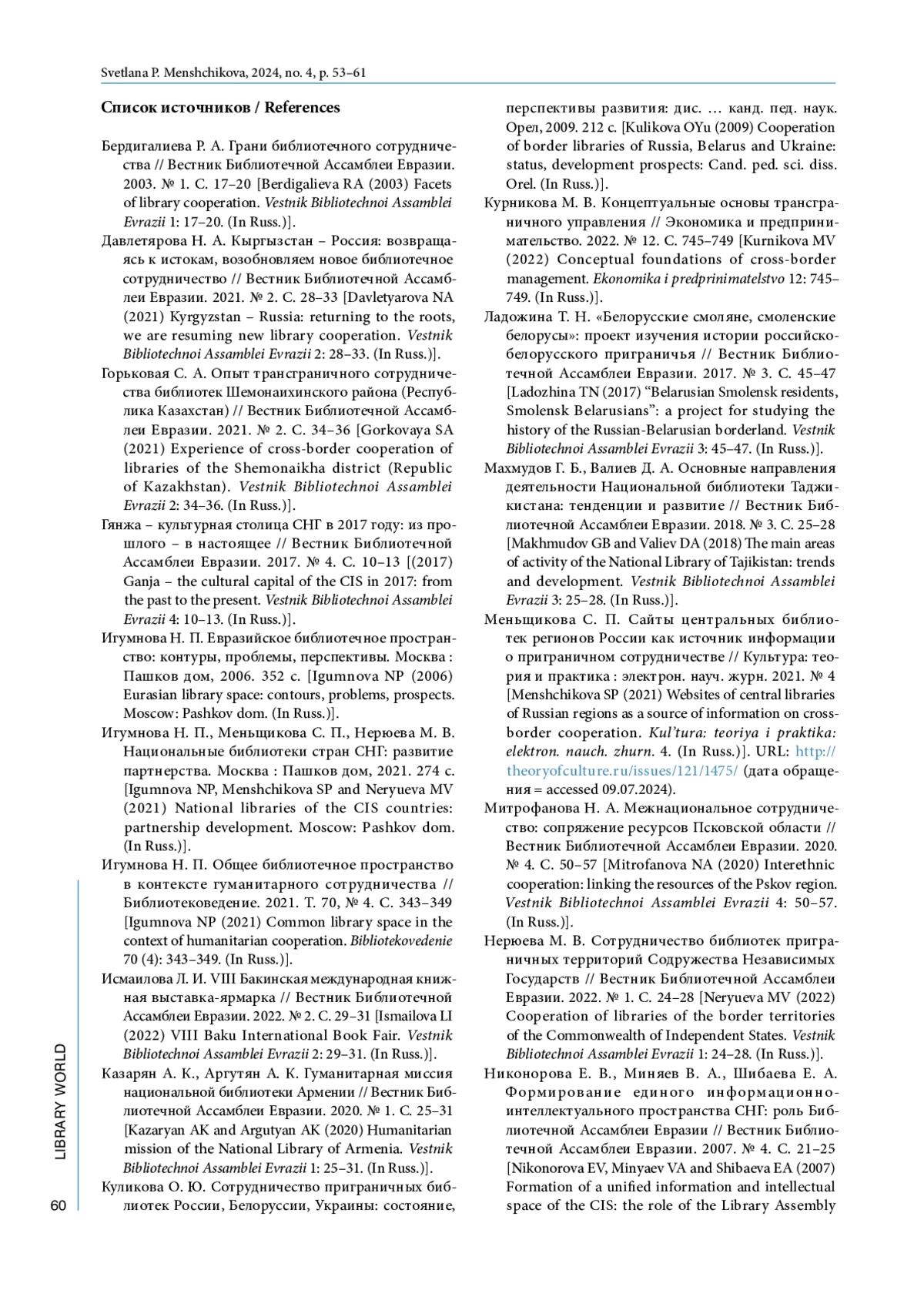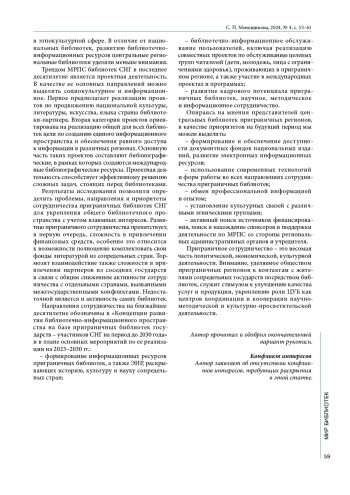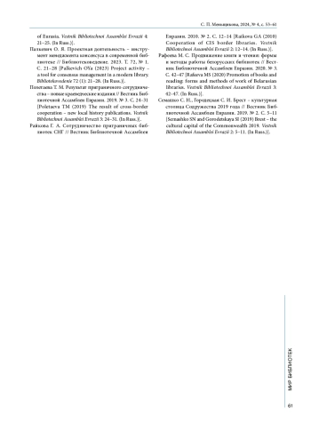 7. Игумнова Н. П. Общее библиотечное пространство в контексте гуманитарного сотрудничества // Библиотековедение. 2021. Т. 70, № 4. С. 343-349.