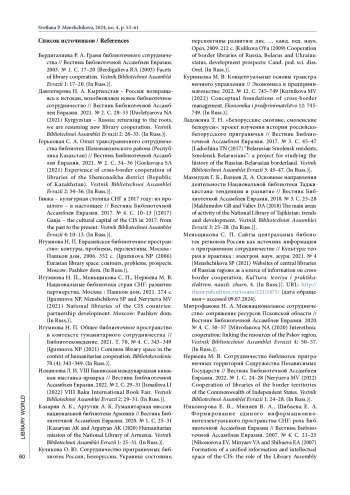 2. Давлетярова Н. А. Кыргызстан - Россия: возвращаясь к истокам, возобновляем новое библиотечное сотрудничество // Вестник Библиотечной Ассамблеи Евразии. 2021. № 2. С. 28-33.