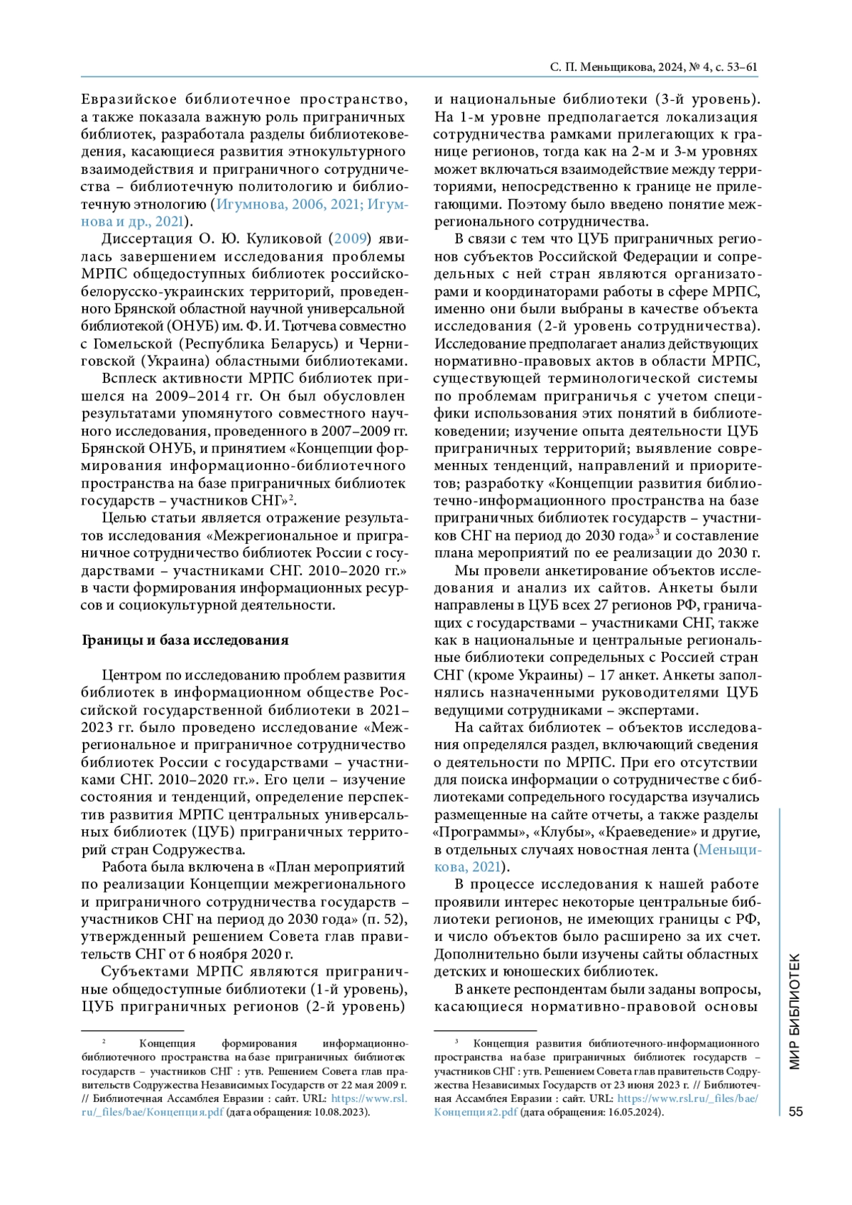 14. Меньщикова С. П. Сайты центральных библиотек регионов России как источник информации о приграничном сотрудничестве // Культура: теория и практика : электрон. науч. журн. 2021. № 4. URL: http://theoryofculture.ru/issues/121/1475 (дата обращения = accessed 09.07.2024).