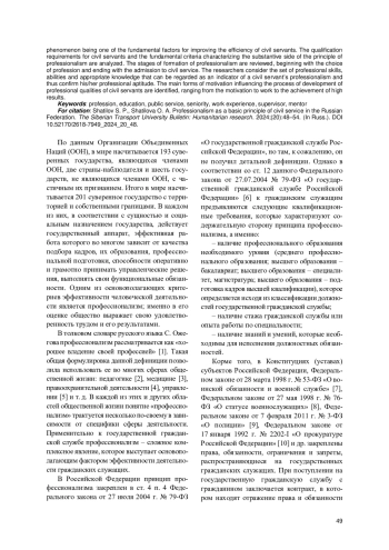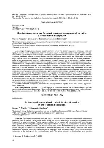 Современные реалии свидетельствуют о том, что не все гражданские служащие отвечают предъявляемым к ним требованиям, поэтому решение задач по повышению качества подготовки и переподготовки кадров для работы в государственных органах приобретает в настоящее время первостепенное значение. Решение данной задачи позволит повысить кадровый потенциал и, как следствие, эффективность работы органов управления. Реализация любого направления социальной деятельности связана с работой государственных органов, эффективность которой зависит от качественного подбора кадров, уровня их образования, способности принимать правильные решения. Одним из основополагающих принципов обеспечения эффективности является профессионализм; именно это понятие отражает удовлетворенность общества результатами какого-либо труда. В статье рассматривается профессионализм как комплексное и сложное явление, выступающее одним из основополагающих факторов повышения эффективности деятельности гражданских служащих. Исследованы квалификационные требования, предъявляемые к гражданским служащим, и основополагающие критерии, характеризующие содержательную сторону принципа профессионализма. Рассмотрены этапы формирования профессионализма, начиная с выбора профессии и заканчивая поступлением на гражданскую службу. Проанализирована совокупность профессиональных знаний, умений и навыков, выступающих показателем профессионализма гражданского служащего и подтверждающих его профессиональную пригодность. Выявлены основные формы мотивации, влияющие на процесс развития профессиональных качеств гражданских служащих от побуждения к деятельности до достижения конечного высокого результата.