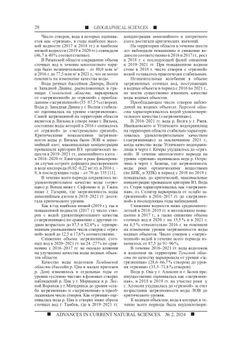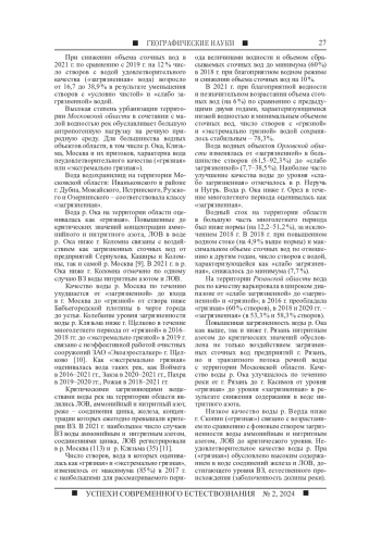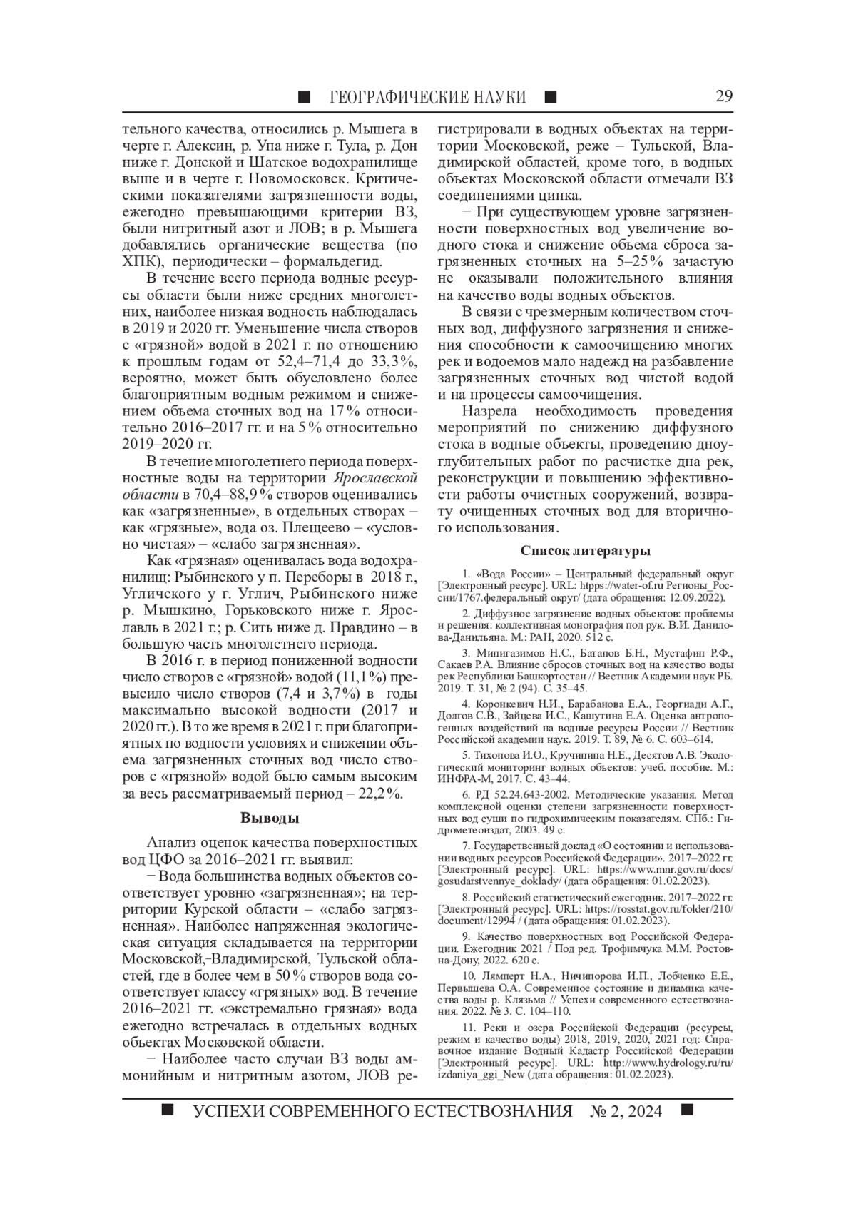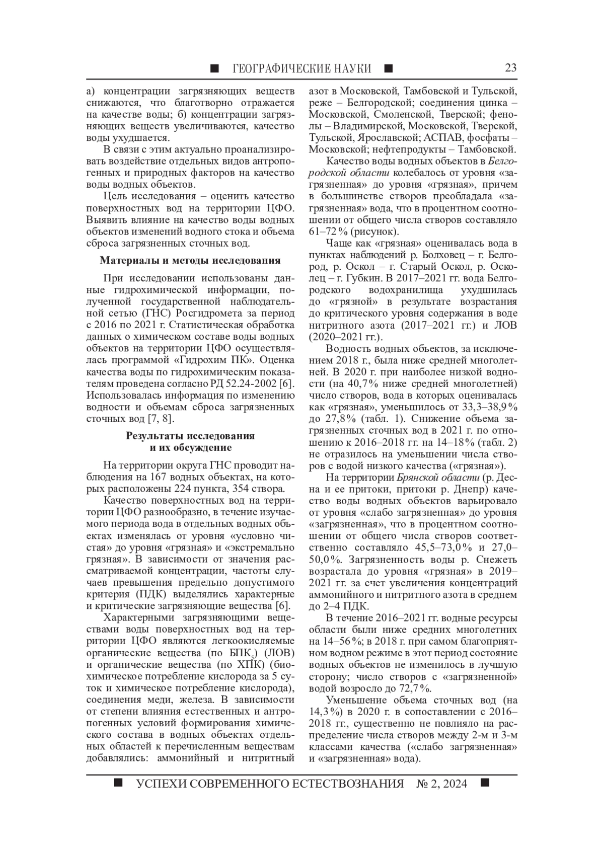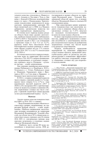 ЛЯМПЕРТ Н. А., НИЧИПОРОВА И. П., ПЕРВЫШЕВА О. А., ХОРОШЕВСКАЯ В. О., ГОЛУБКИНА М. А., ЛОБЧЕНКО Е. Е. ИЗМЕНЕНИЕ КАЧЕСТВА ПОВЕРХНОСТНЫХ ВОД НА ТЕРРИТОРИИ ЦЕНТРАЛЬНОГО ФЕДЕРАЛЬНОГО ОКРУГА В 2016-2021 ГГ. // УСПЕХИ СОВРЕМЕННОГО ЕСТЕСТВОЗНАНИЯ. 2024. № 2