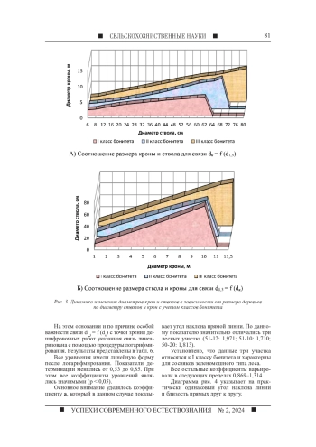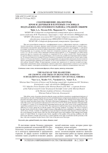 При всем разнообразии вопросов о дешифрировании полога и эффективном переходе к морфологическим показателям отдельных деревьев задачи изучения соотношения диаметров крон и стволов в высокополнотных насаждениях представлены недостаточно и требуют отдельного исследования. С этой целью в условиях подтаежно-лесостепного района проведены полевые работы в сосняках I-III классов бонитета. В насаждениях на 14 лесных участках (выделах) измерялись радиусы крон в четырех направлениях (С-Ю, С-З, С-В, Ю-З, Ю-В, З-В) и диаметры стволов сосны на высоте 1,3 м. Установлено, что связь между радиусами крон по сторонам света менялась от умеренной (0,34) до очень тесной (0,94). Оценка радиусов по классам бонитета показала, что различий крон с учетом качества условий местопроизрастания не выявлено. По классам бонитета в сосняках III класса бонитета установлена более высокая по тесноте связь в сравнении с I и II классами бонитета. Разработан ряд нормативов для определения диаметров стволов на высоте груди и диаметров крон деревьев для сосняков I, II, III-го классов бонитета и условиях подтаежно-лесостепного района Средней Сибири. В перегущенных сосняках вне зависимости от качества условий местопроизрастания соотношение между диаметрами стволов и крон имеет определенную схожесть в угле наклона и близости линий, с некоторым исключением для сосняков I класса бонитета зеленомошного типа леса.