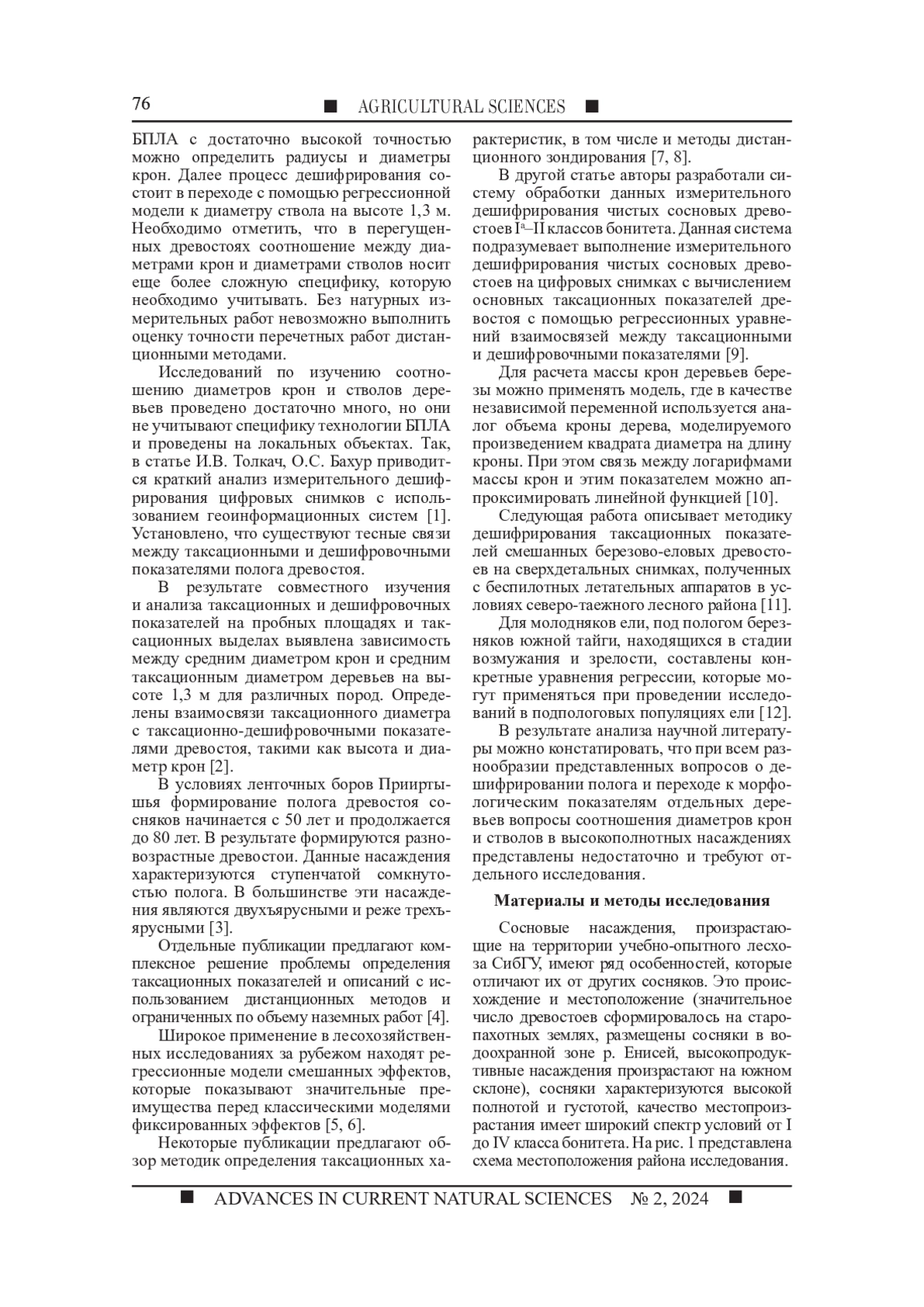 12. Богданов А.П., Алешко Р.А., Шошина К.В. Особенности дешифрирования березово-еловых древостоев с применением беспилотного летательного аппарата (БПЛА) в условиях северо-таежного лесного района // Подготовка кадров в условиях перехода на инновационный путь развития лесного хозяйства: научно-практическая конференция (Воронеж, 21-22 октября 2021 г.). Воронеж: Воронежский государственный лесотехнический университет им. Г.Ф. Морозова, 2021. С. 118-122. EDN: ESVVXS