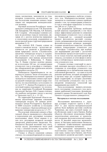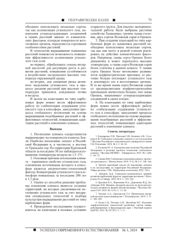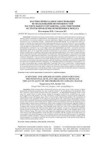 Глобальное потепление климата влияет на все процессы жизнедеятельности человека, различные отрасли экономики. В официальных международных и российских документах в качестве причины глобального потепления называется усиление парникового эффекта вследствие интенсивных выбросов углекислого газа от сжигания топлива - антропогенно-техногенный фактор. В то же время не следует исключать из причин обострения проблемы и природные факторы поступления углекислого газа в атмосферу. Одним из последствий глобального потепления является усиление аридизации климата. Данная проблема остро проявляется в Курганской области. Назрела необходимость в разрешении данной проблемы. Снижать концентрацию углекислого газа в атмосфере можно при выращивании растений с достаточно интенсивным процессом фотосинтеза. Научным сообществом предложена и обоснована идея создания полей по типу карбоновых ферм. На их территории проводятся наблюдения за растениями, способными интенсивно поглощать углекислый газ в процессе фотосинтеза при увеличении фитомассы, что создает условия для повышения адаптации растений к неблагоприятному воздействию окружающей среды. Аналогичная плантация была заложена на территории Ботанического сада Курганского государственного университета из растений семейства Тыквенные. У них достаточно хорошо развита фотосинтетическая активность за счет деятельности всей наземной вегетативной части растений. Проведен поиск стимуляторов роста и развития растений, что может способствовать адаптации растений семейства Тыквенные к действию климатических изменений. Результаты исследования позволяют утверждать, что тыквенные хорошо ассимилируют углекислый газ, могут быть использованы при создании карбоновых плантаций. При этом в соответствии с хозяйственными потребностями региона можно использовать растения семейства, относящиеся не только к разным сортам, но и из разных родов, будь то тыква, арбуз, огурец и др. Используя предпосевную обработку семян биологическими стимуляторами роста и развития растений, можно снижать риск воздействия высоких температур на рост и развитие растений и их фотосинтетическую активность.