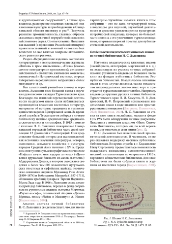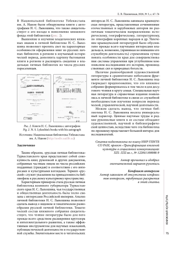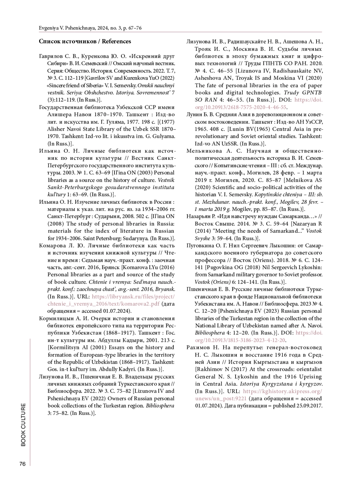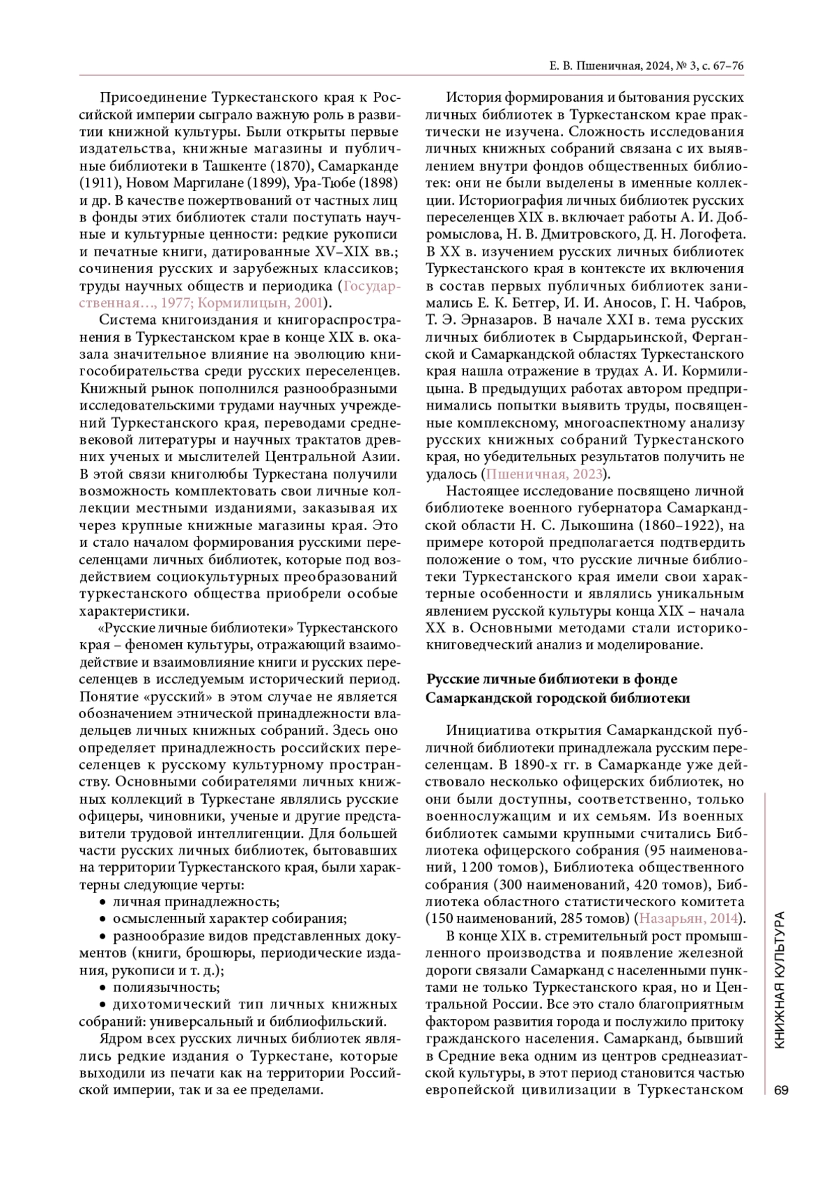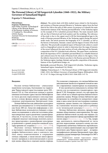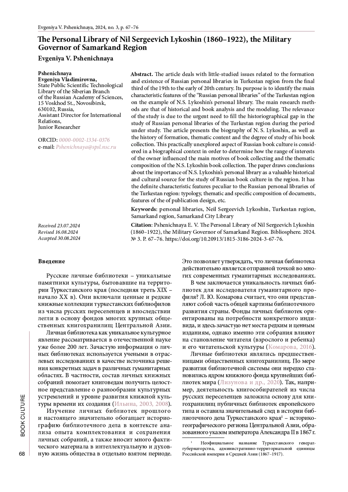 ПШЕНИЧНАЯ Е. В. ЛИЧНАЯ БИБЛИОТЕКА ВОЕННОГО ГУБЕРНАТОРА САМАРКАНДСКОЙ ОБЛАСТИ НИЛА СЕРГЕЕВИЧА ЛЫКОШИНА (1860–1922) // БИБЛИОСФЕРА. 2024. №3