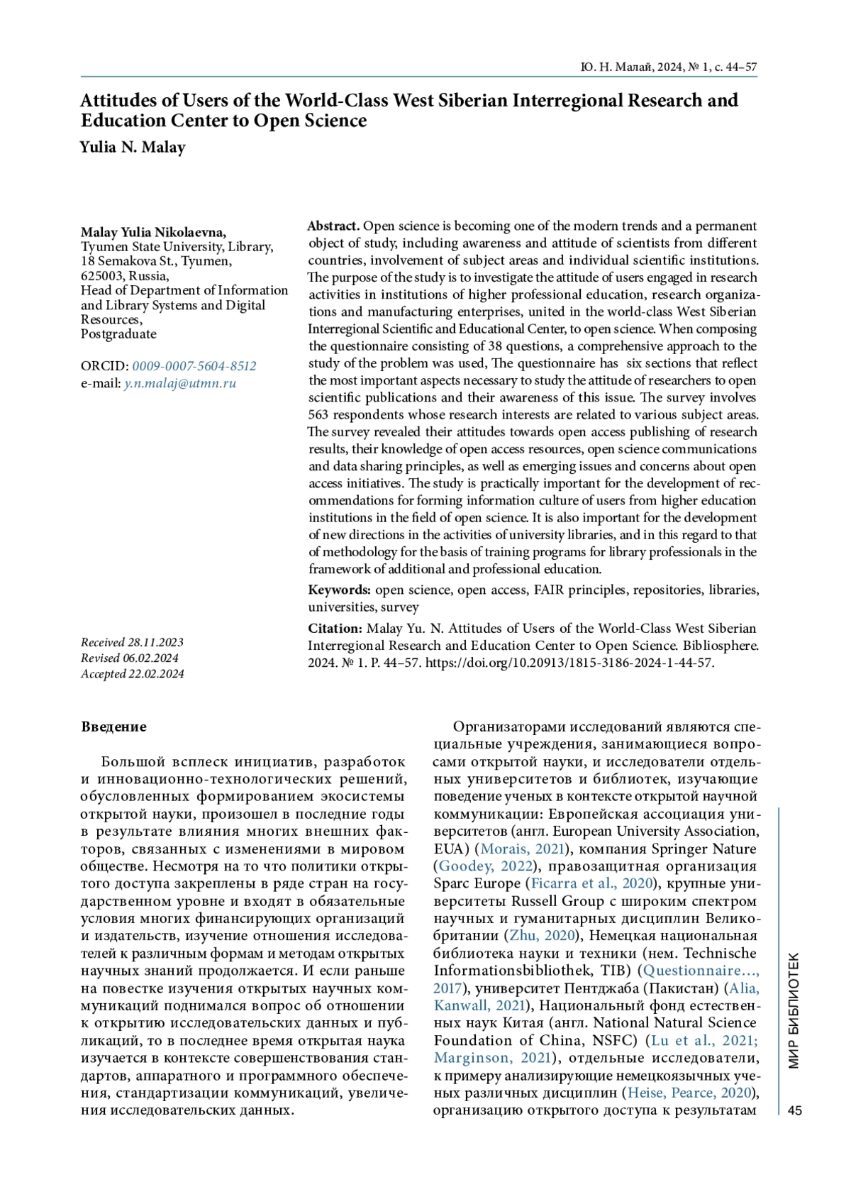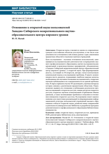 Открытая наука становится одним из современных трендов и постоянным объектом для изучения, в том числе осведомленности и отношения к ней ученых разных стран, вовлечения предметных областей и отдельных научных учреждений. Цель исследования – изучение отношения пользователей, занимающихся исследовательской деятельностью в учреждениях высшего профессионального образования, научно-исследовательских организаций и производственных предприятий, объединенных в Западно-Сибирский межрегиональный научно-образовательный центр мирового уровня 1, к открытой науке. При формировании анкеты, состоящей из 38 вопросов, авторы статьи использовали комплексный подход к исследованию проблемы. В анкете скомпонованы шесть разделов, отражающих наиболее важные аспекты, необходимые для изучения отношения исследователей к открытым научным публикациям и их осведомленности по данной проблематике. В опросе приняли участие 563 респондента, научные интересы которых связаны с различными предметными областями. Опрос позволил выявить их отношение к публикации результатов научных исследований в открытом доступе, знание ресурсов открытого доступа, открытых научных коммуникаций и принципов обмена данными, а также возникающие проблемы и опасения в отношении инициатив открытого доступа. Исследование имеет важное значение для подготовки рекомендаций по формированию информационной культуры пользователей учреждений высшего образования в области открытой науки, развития новых направлений в деятельности университетских библиотек и разработки программ дополнительного и профессионального образования библиотечных специалистов.