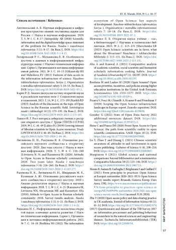 7. Редькина Н. С. Информационная экосистема открытой науки: ключевые аспекты развития // Научно-техническая информация. Серия 1, Организация и методика информационной работы. 2022. № 7. С. 10-18