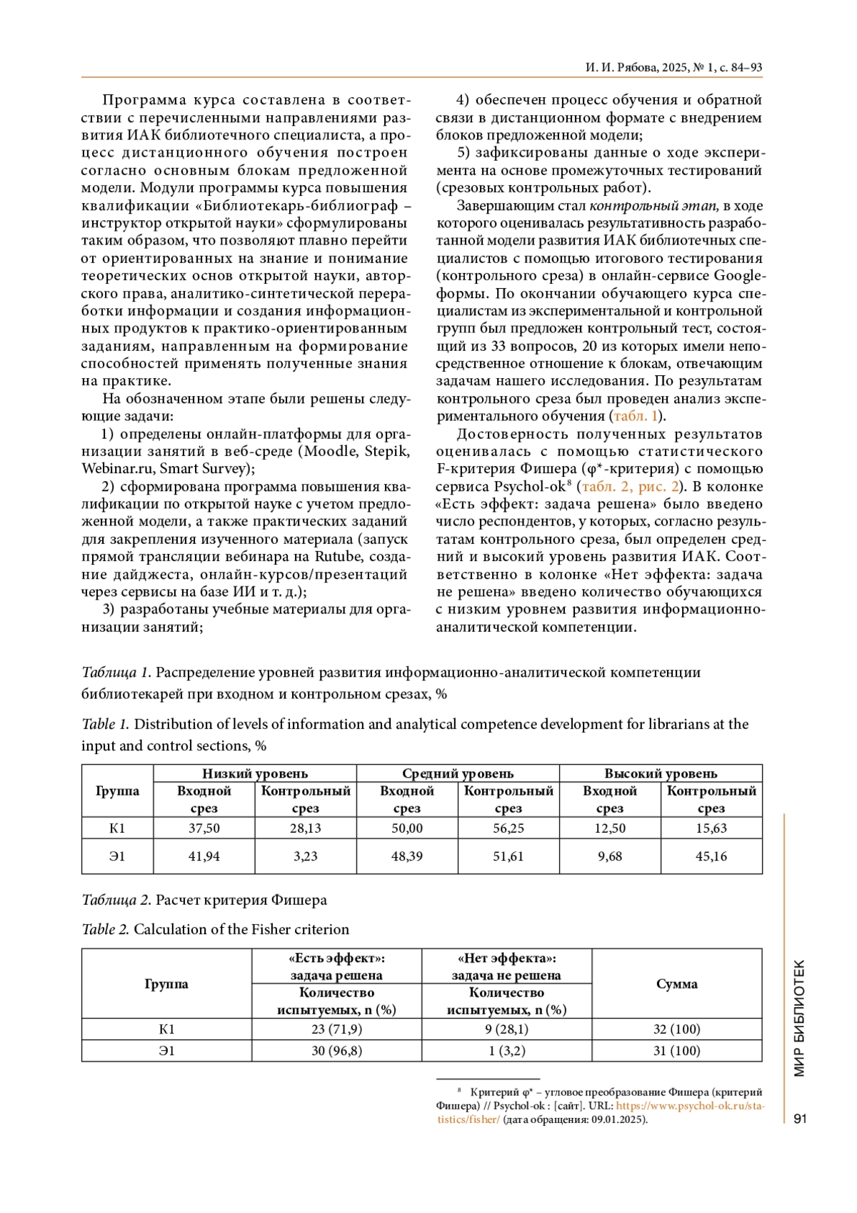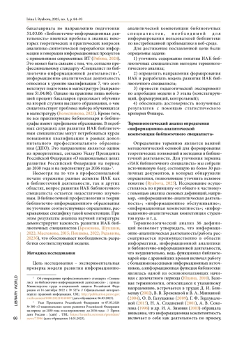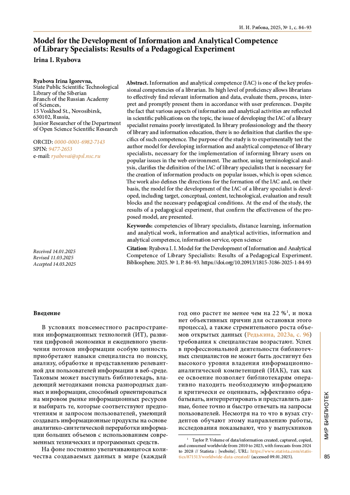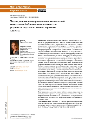 Информационно-аналитическая компетенция (ИАК) является одной из ключевых в перечне профессиональных компетенций библиотечного специалиста, так как высокий уровень владения ею позволяет библиотекарям эффективно находить релевантную информацию и данные, оценивать их, обрабатывать, интерпретировать и оперативно представлять в соответствии с предпочтениями пользователей. Несмотря на то что в научных публикациях по теме отражаются разные аспекты информационно-аналитической деятельности, вопрос развития ИАК библиотечного специалиста остается слабо изученным. В библиотечной профессиологии и теории библиотечно-информационного образования не уточнено определение, раскрывающее специфику такой компетенции. Цель исследования – экспериментальная проверка авторской модели развития информационно-аналитической компетенции библиотечных специалистов, необходимой для реализации информирования пользователей библиотеки по востребованной проблематике в веб-среде. Автор с помощью терминологического анализа и специфики библиотечно-информационной деятельности уточняет определение ИАК библиотечных специалистов, необходимой для создания современных информационно-аналитических продуктов по востребованной проблематике, коей выступает открытая наука, а также определяет направления формирования ИАК, и на их основе разрабатывает модель развития ИАК библиотечного специалиста, включающую целевой, концептуальный, содержательный, технологический, оценочно-результативный блоки и необходимые педагогические условия. В завершении исследования представлены итоги педагогического эксперимента, подтверждающие результативность предложенной модели.